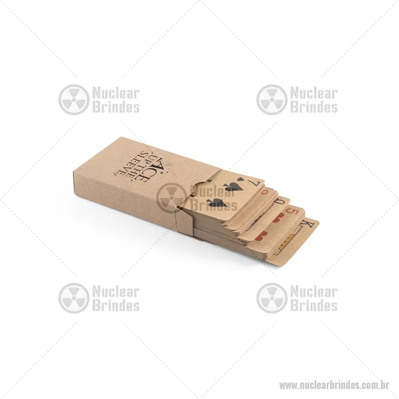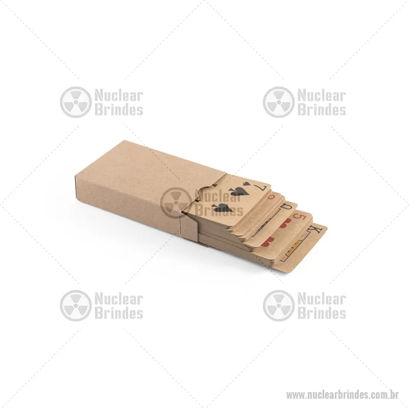 Baralho de 54 cartas clássicas em papel kraft Baralho com 54 cartas clássicas em papel kraft, proveniente de gestão florestal sustentável, ideal para compartilhar bons momentos com amigos e família. Fornecidas em caixa presente de papel kraft reciclado. A cor e o resultado da impressão nos materiais naturais pode variar entre produtos. medidas: 60 x 90 x 20 mm Peso do Produto (g.): 57 - Brindes Personalizados - NUCJOG011