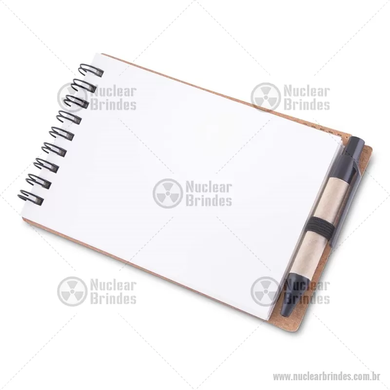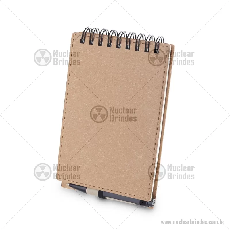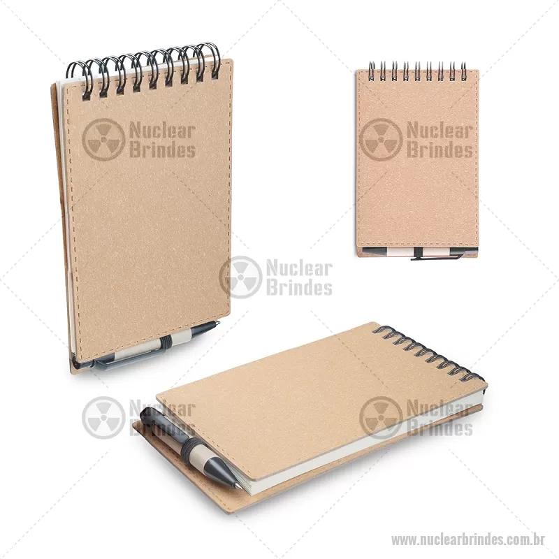 Mini Bloco/ Caderno A6 de anotações com caneta Mini Caderno com capa em papelão e encadernação espiral wire-o, 70 folhas sem pauta em 70g/m². Acompanha caneta confeccionada em papelão reciclado com detalhe em plástico. Dimensão Produto: 14x9cm (Caderno) Dimensão Produto: 8,3xø1cm (Caneta) Peso do Produto: 0,084kg - Brindes Personalizados - NUCBLC277