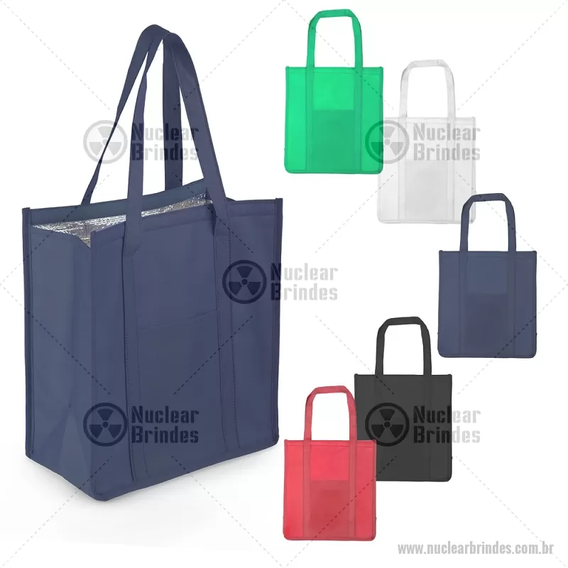 Sacola térmica confeccionada em TNT com gramatura de 80 g/m². Possui interior costurado com revestimento em algodão e folha de alumínio de 2 mm, auxiliando na conservação da temperatura de alimentos e bebidas. Conta com bolso frontal, fechamento em velcro e alça de 50 cm de ponta a ponta, proporcionando praticidade no transporte. - Brindes Personalizados - NUCBT118