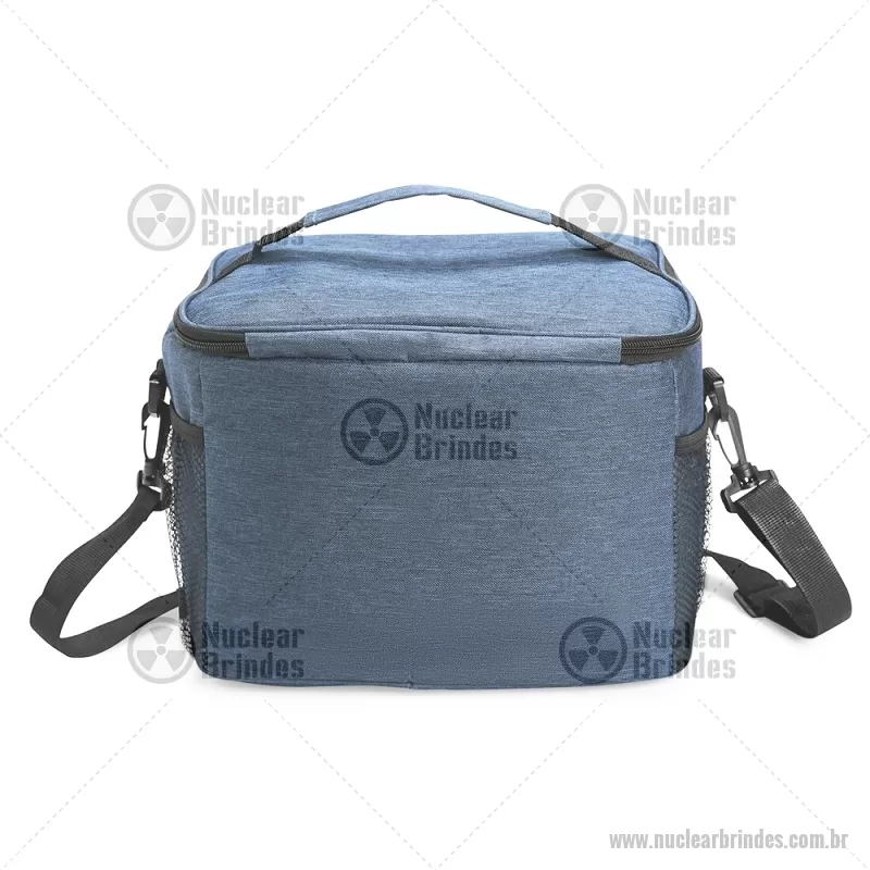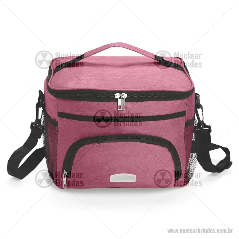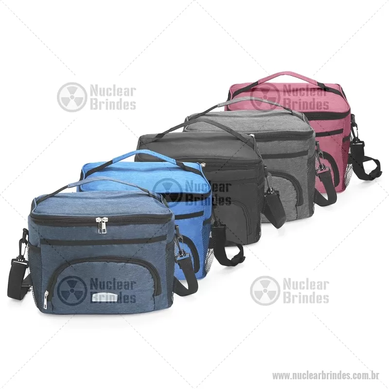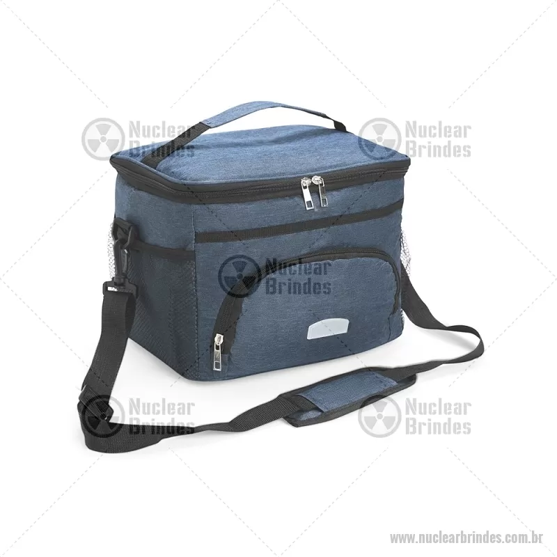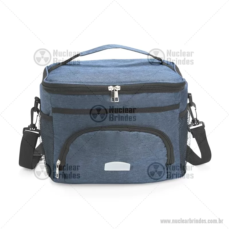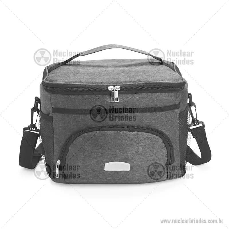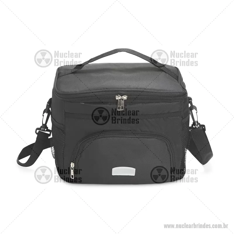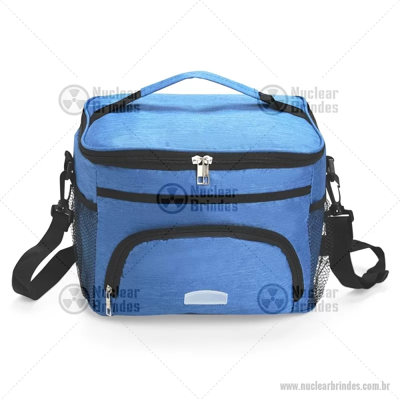 Bolsa térmica de 10 litros feita em poliéster resistente à água, com revestimento interno em PVC laminado. Conta com bolso frontal com zíper, dois bolsos laterais em tela, alça superior fixa e alça transversal removível. Prática e ideal para levar alimentos e bebidas no dia a dia. - Brindes Personalizados - NUCBT103