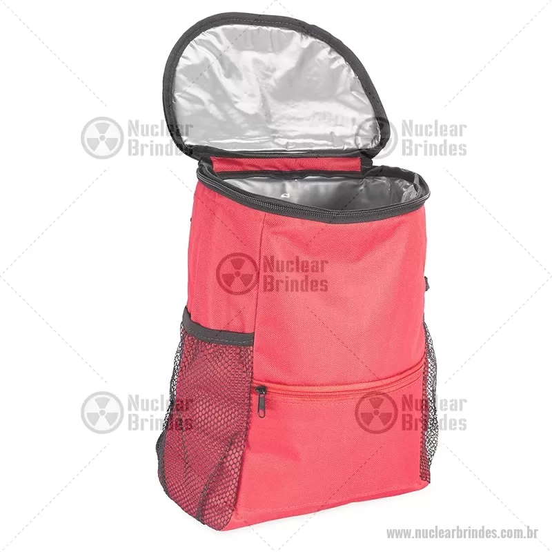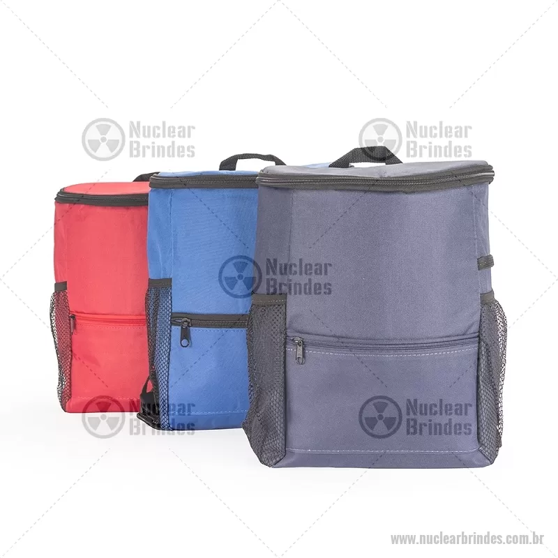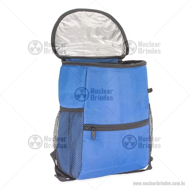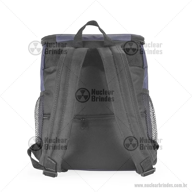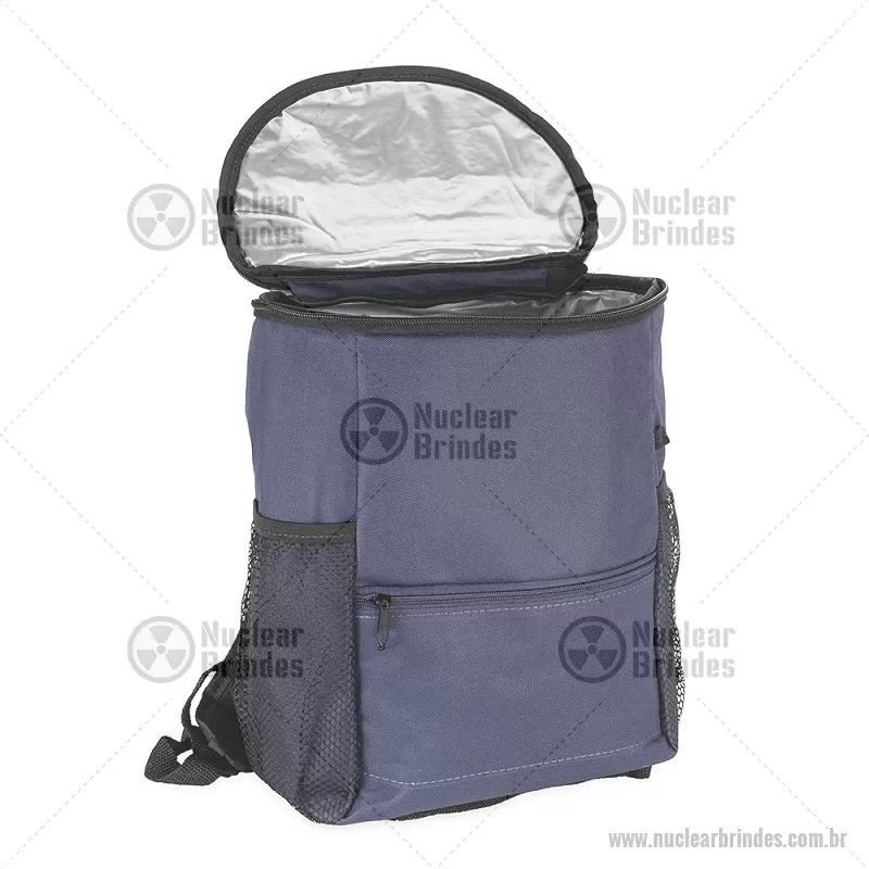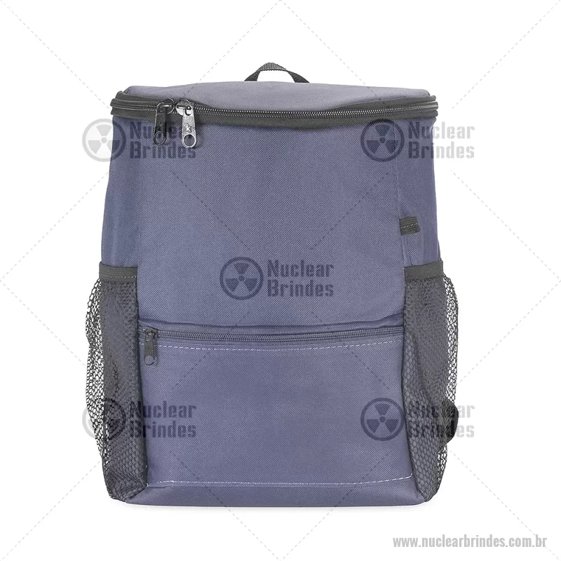Mochila térmica de 10 litros feita em nylon resistente à água e revestimento interno em PEVA atóxico antivazamento, ideal para manter alimentos e bebidas frescos. Possui bolso frontal e traseiro com zíper, além de bolsos laterais em tela para garrafas. Prática e versátil para trabalho, estudos ou uso diário. - Brindes Personalizados - NUCBT096