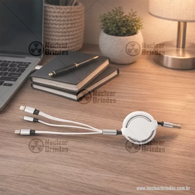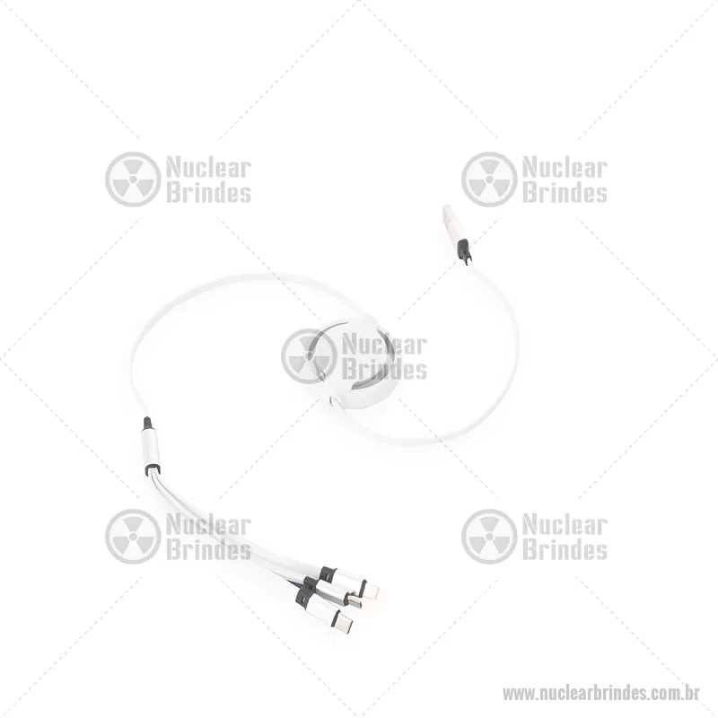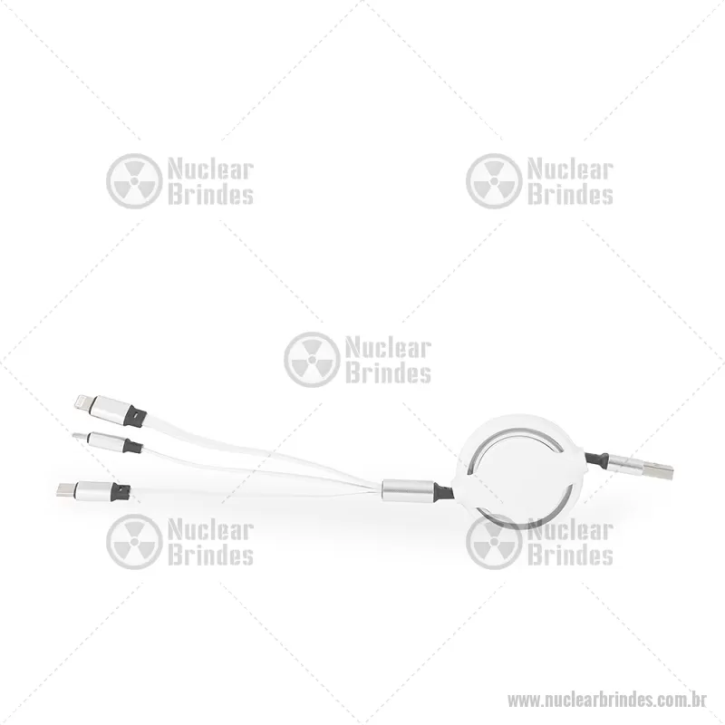 Cabo USB retrátil 3 em 1 com extensão máxima de 1m. Possui conectores USB-C, Micro USB e Lightning em uma extremidade e conector USB-A na outra. Observação: cabo destinado apenas à recarga; não realiza transferência de dados. Altura : 24 cm x Largura : 5 cm Comprimento : cabo 100cm Peso aproximado (g): 37 - Brindes Personalizados - NUCTEC549