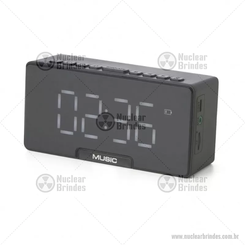 Caixa de som multimídia com relógio despertador e suporte para celular. Produzida em plástico e com borrachas antiderrapantes na área inferior, a caixa de som tem a área frontal com display de LED, além de um compartimento com suporte para celular – uma espécie de “gaveta” aonde é exibido (MUSIC), basta puxá-la ter acesso ao compartimento. A caixa de som executa nos modos bluetooth, cartão TF-microSD e entrada auxiliar P2. Acompanha cabo USB e manual em inglês. Medidas: Altura : 6,2 cm x Largura : 12,4 cm x espessura : 4,1 cm Peso aproximado (g): 230 Material : Plástico Duração da Bateria: ± 14 Horas Frequência: 100Hz – 18KHz Potência de entrada: 5V == 1000mA Bluetooth: V 5.0 - Brindes Personalizados - NUCTEC441