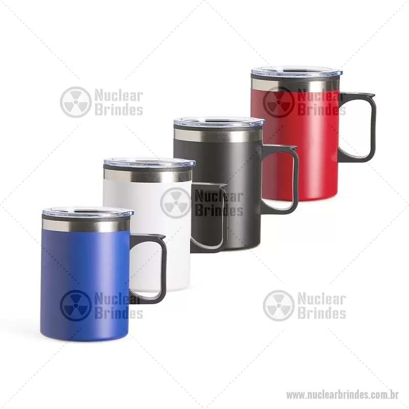 Caneca com capacidade de até 375 ml, produzida em plástico com revestimento externo em inox, que ajuda a reduzir o contato direto com a temperatura dos líquidos. Possui tampa plástica com bocal e trava de segurança, além de base emborrachada antiderrapante, proporcionando mais estabilidade durante o uso. - Brindes Personalizados - NUCCAN106