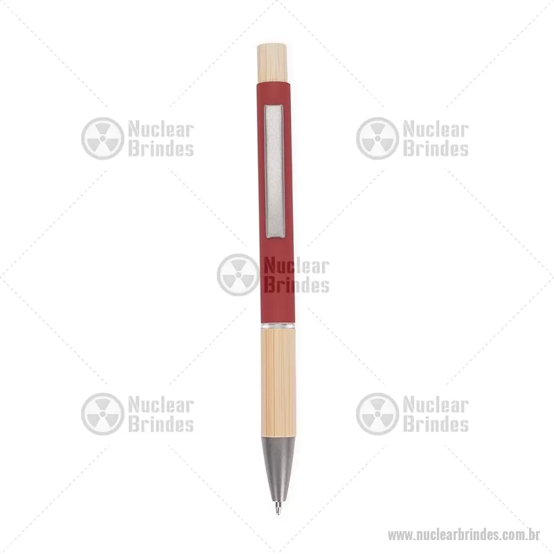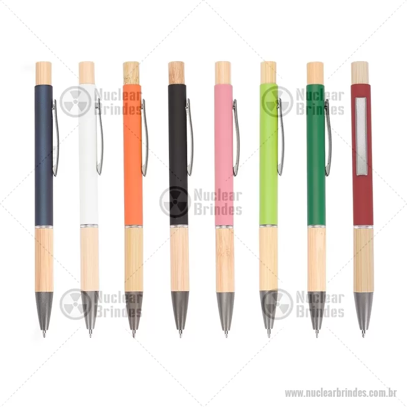 Caneta esferográfica azul 1,0 mm com corpo metálico, detalhes em bambu e acionamento por clique. Leve e confortável, proporciona escrita precisa no dia a dia. - Brindes Personalizados - NUCCMT296