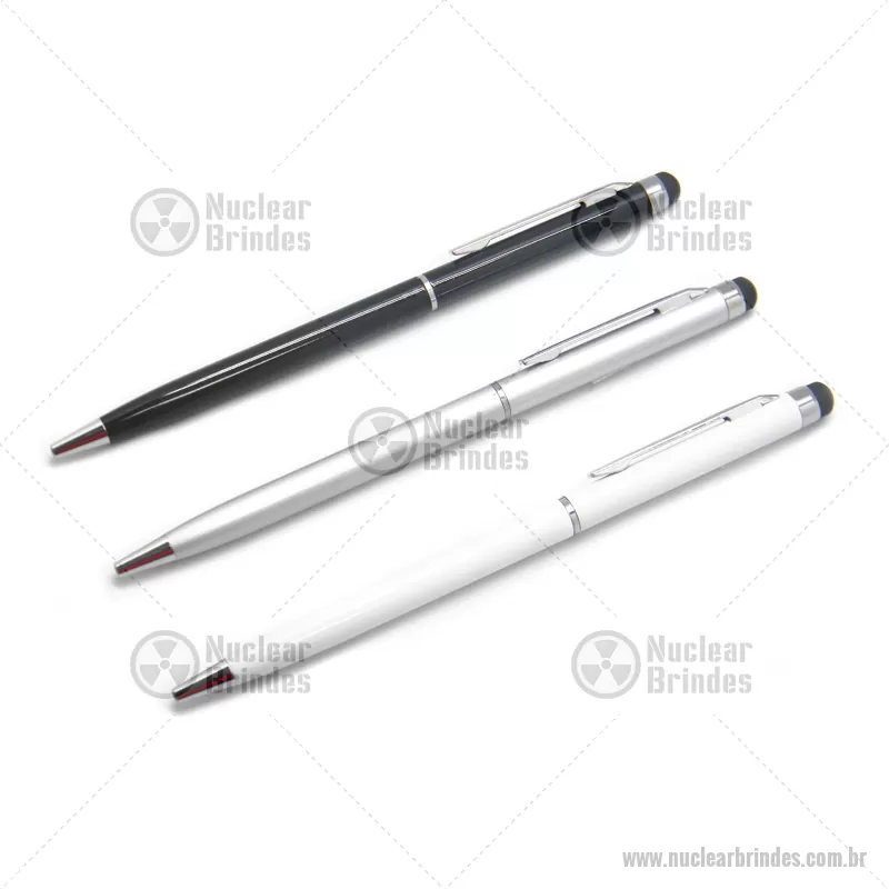 Caneta de Metal esferográfica fininha. Multifunção 2 em 1 com ponteira touch. Disponíveis nas cores: preta, prata e branca. - Brindes Personalizados - NUCTEC046