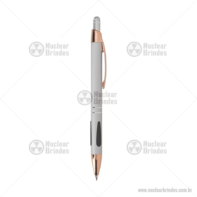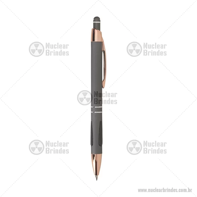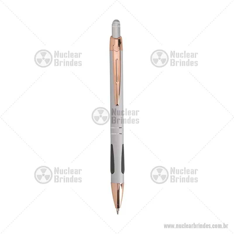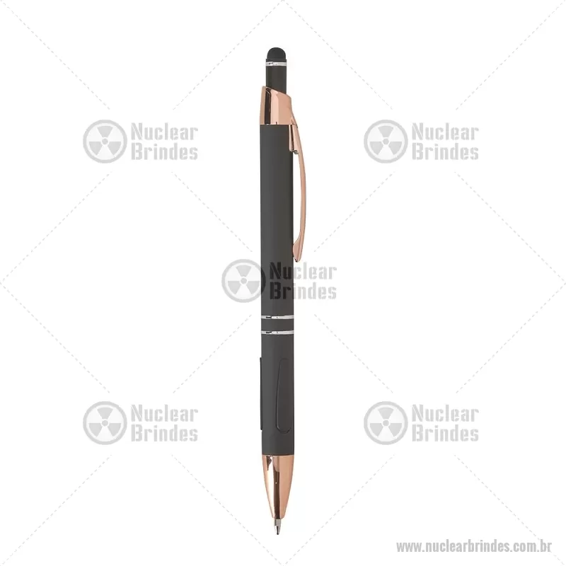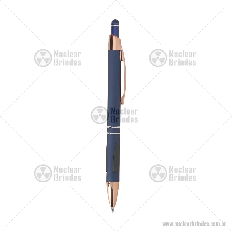Caneta em metal com detalhes emborrachados, carga esferográfica azul 1,0 mm e acionamento por clique. Possui ponta touch emborrachada para uso em telas sensíveis ao toque, unindo escrita e praticidade em um só item. - Brindes Personalizados - NUCCMT295