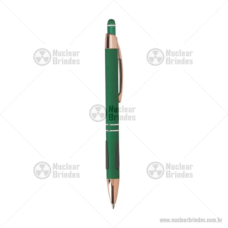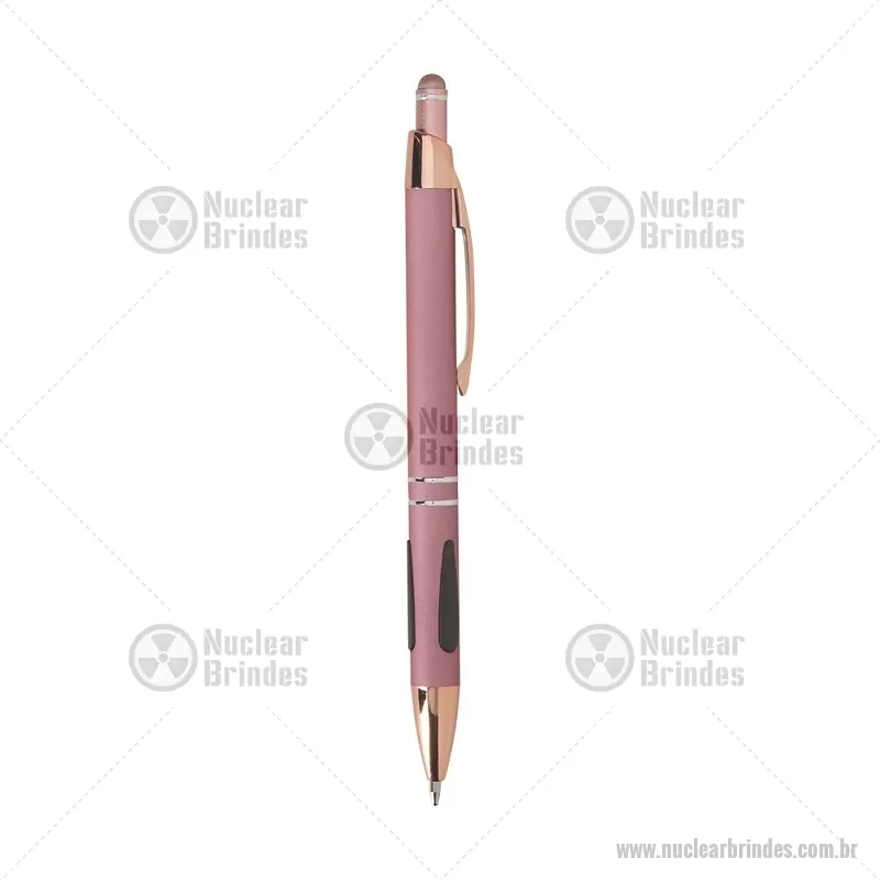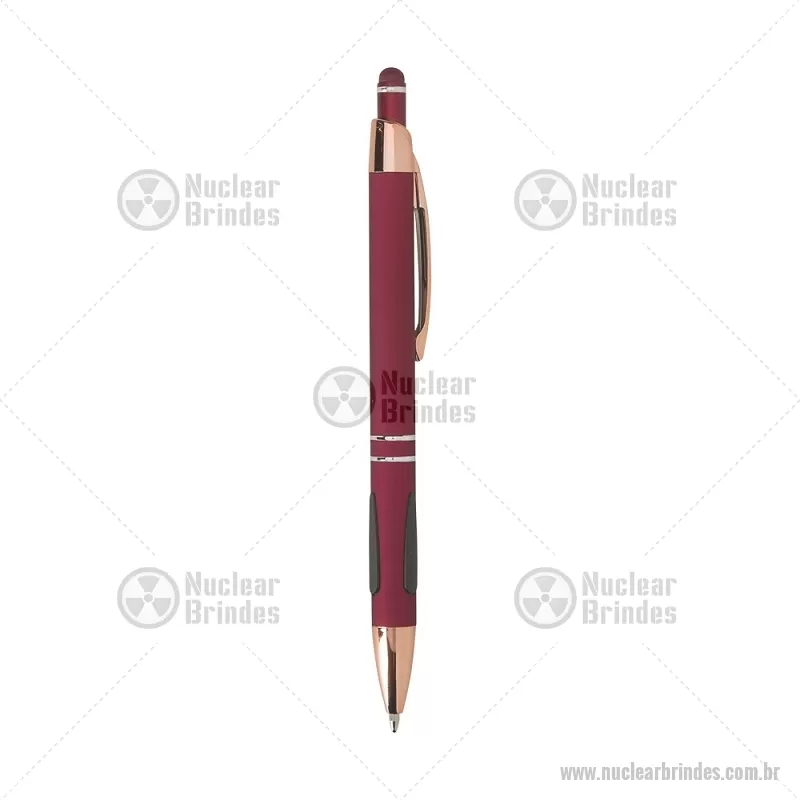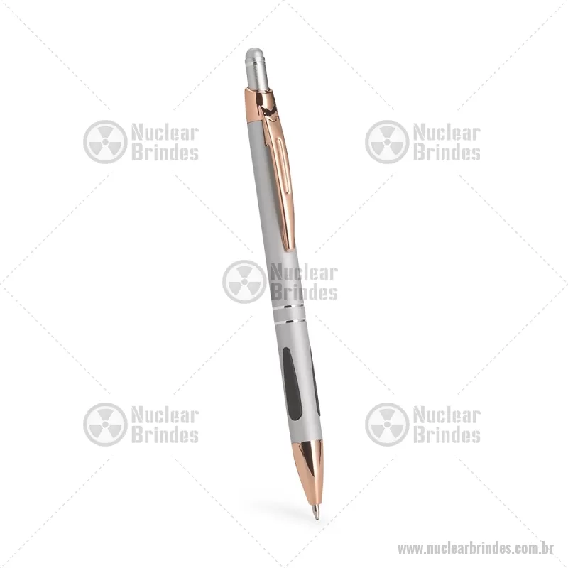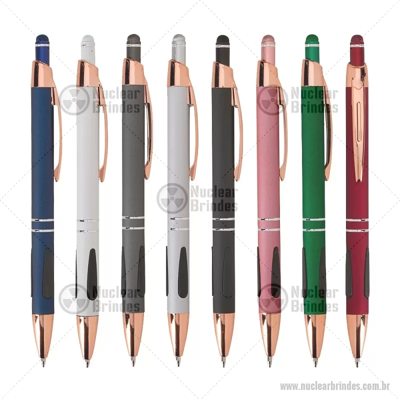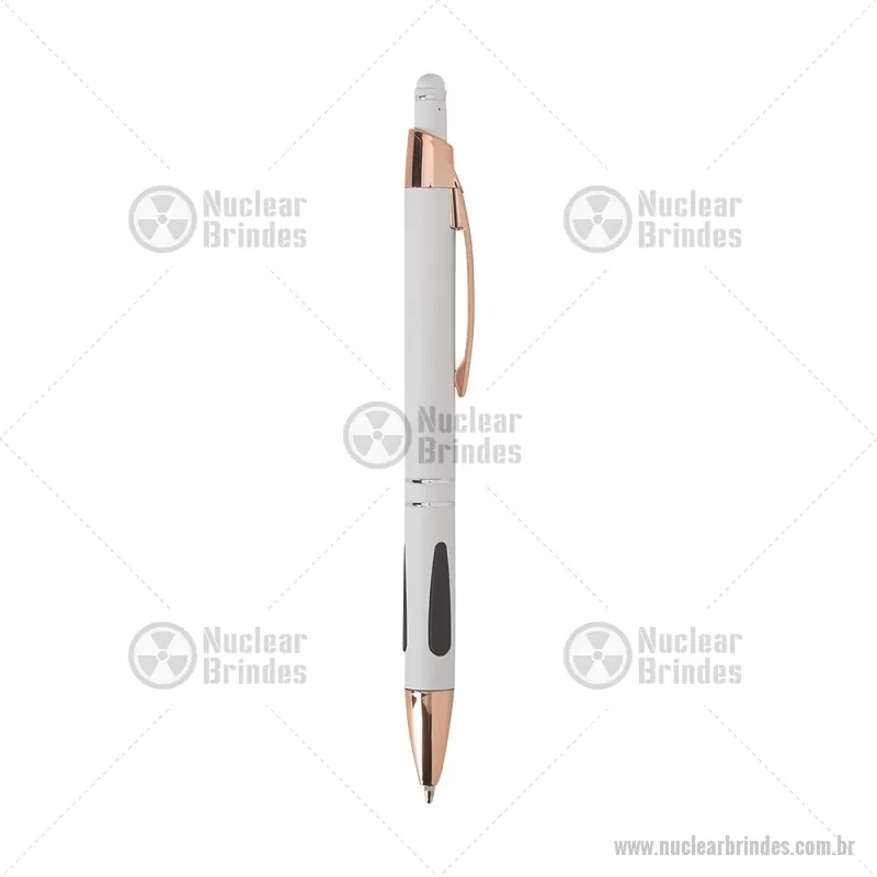 Caneta em metal com detalhes emborrachados, carga esferográfica azul 1,0 mm e acionamento por clique. Possui ponta touch emborrachada para uso em telas sensíveis ao toque, unindo escrita e praticidade em um só item. - Brindes Personalizados - NUCCMT295