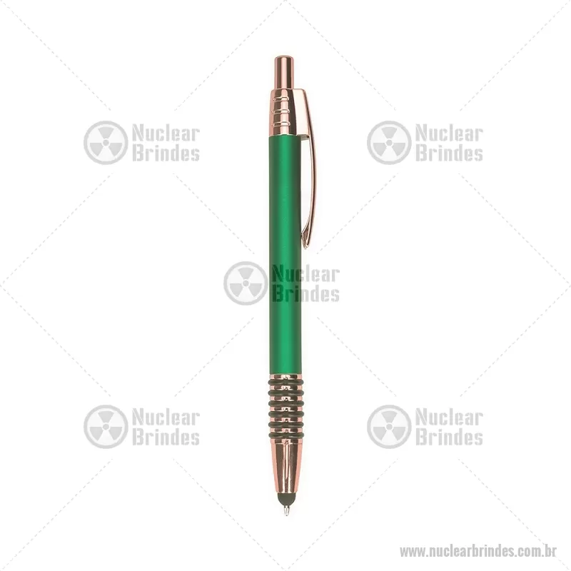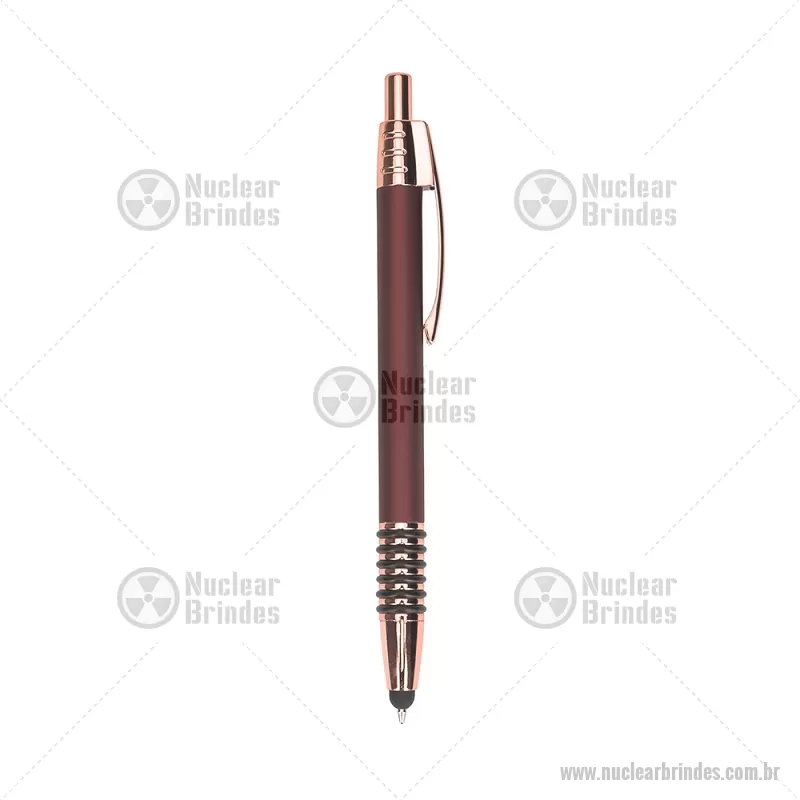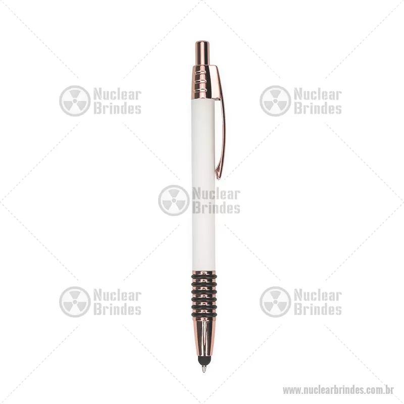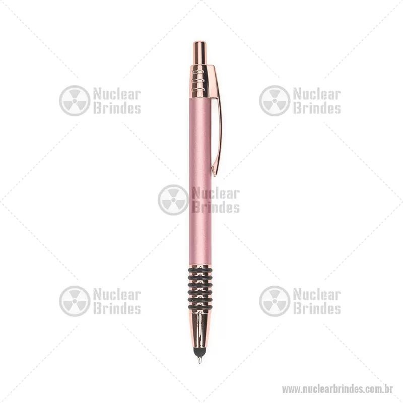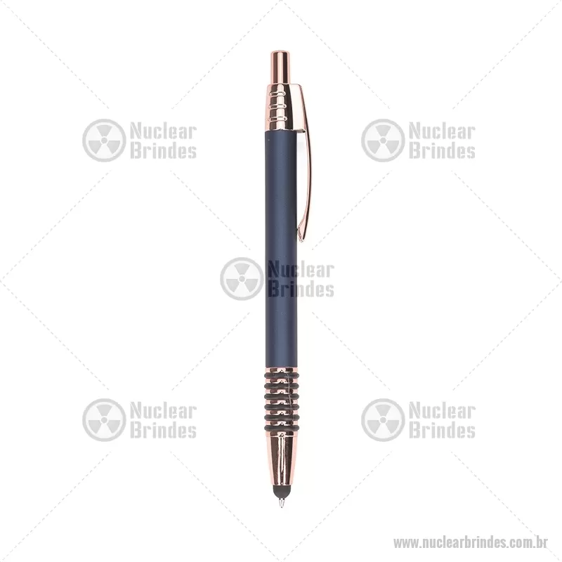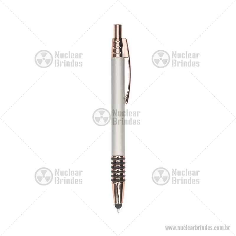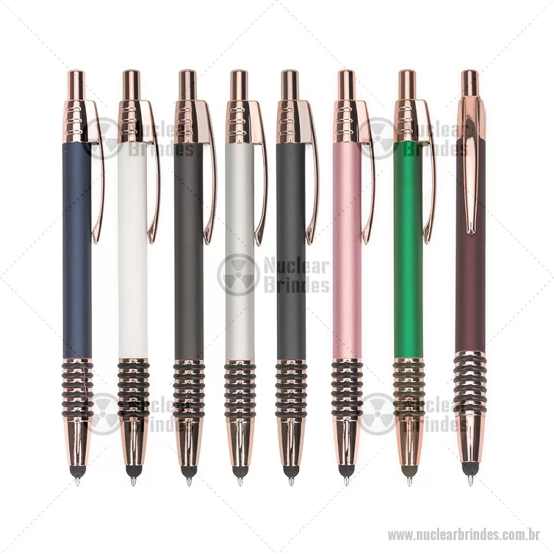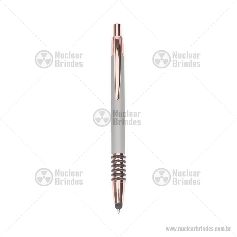 Caneta metálica com detalhes emborrachados no corpo, garantindo maior conforto na escrita. Possui carga esferográfica azul 1,0 mm, acionamento por clique e ponteira touch para uso em telas sensíveis ao toque. Prática e versátil para o dia a dia. - Brindes Personalizados - NUCCMT298