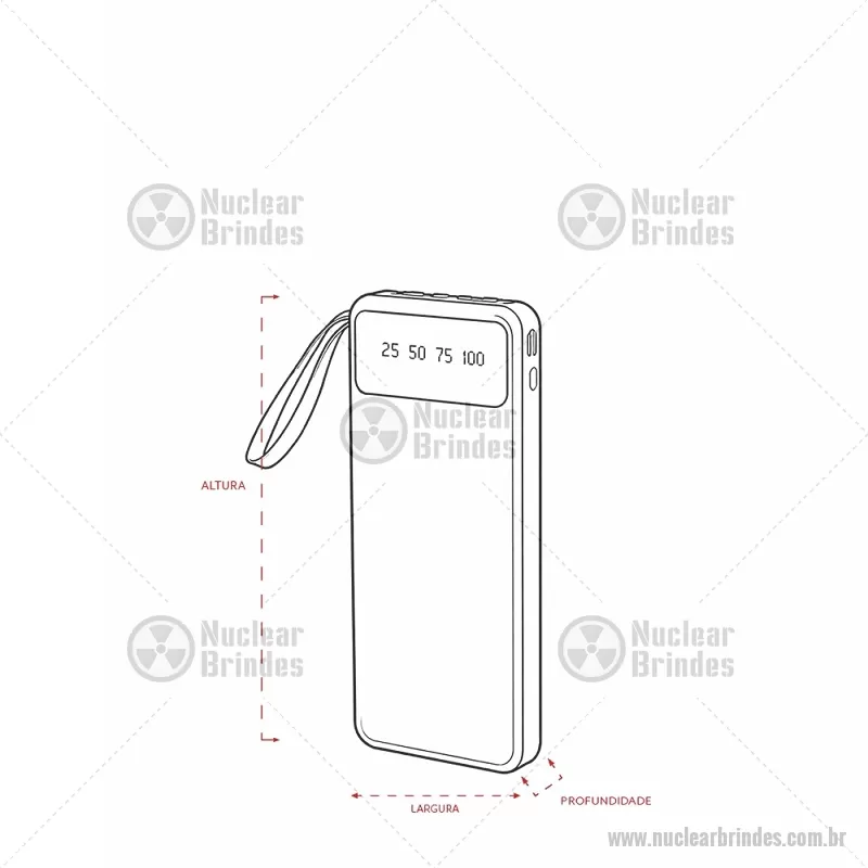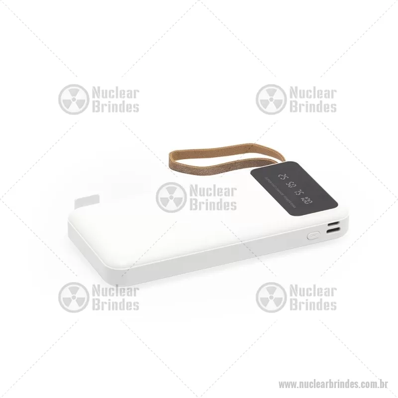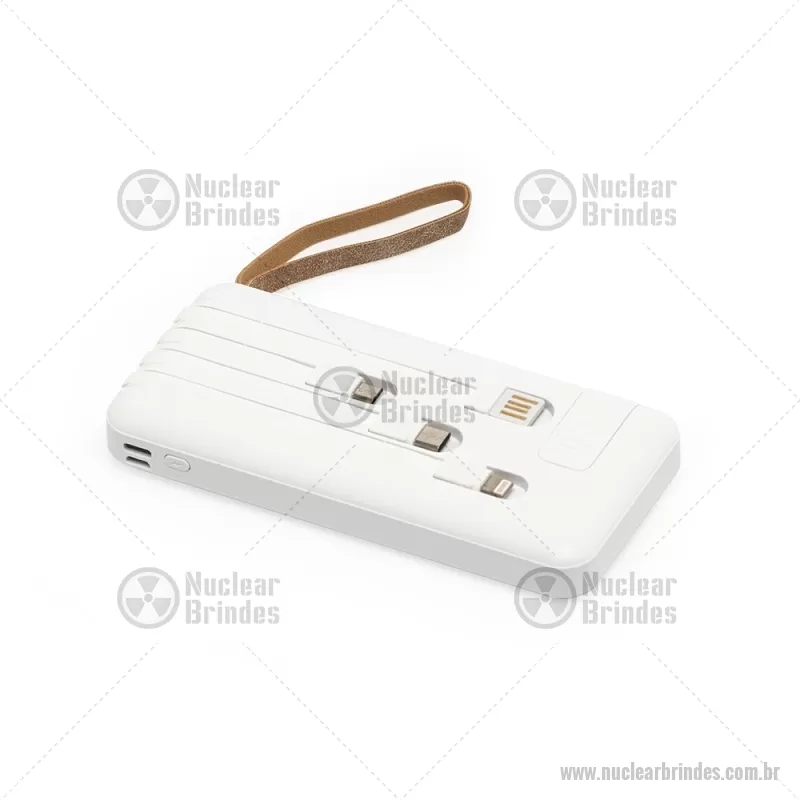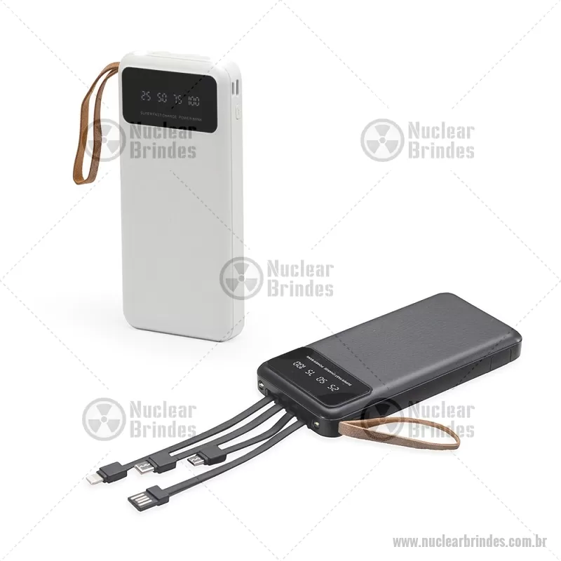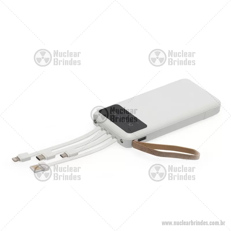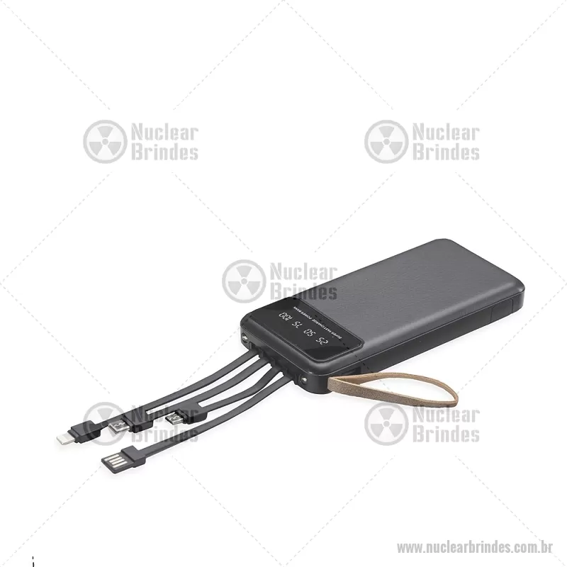 Power Bank 10.000mAh com Lanterna e Multissaídas Descrição: Carregador power bank de 10.000mAh com lanternas, múltiplas saídas e suporte para celular. Fabricado em plástico com display integrado, este power bank vem equipado com quatro cabos de carregamento, eliminando a necessidade de transportar cabos extras. Compatível com entradas V8, Tipo-C, Lightning e USB, praticidade é o sinônimo deste carregador. Com alça de couro sintético e um suporte funcional para celular, estilo gaveta, o power bank possui capacidade real de 6.000mAh para manter os dispositivos sempre carregados. Acompanha cabo USB-V8. medidas: Altura : 14,4 cm x Largura : 6,8 cm x Espessura : 2 cm Peso aproximado (g): 251 - Brindes Personalizados - NUCTEC550