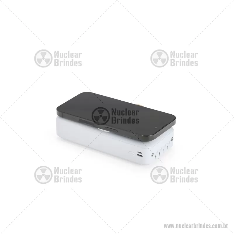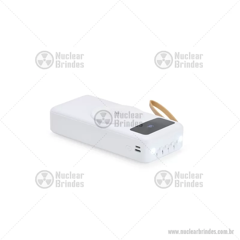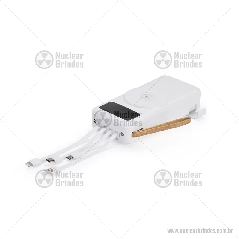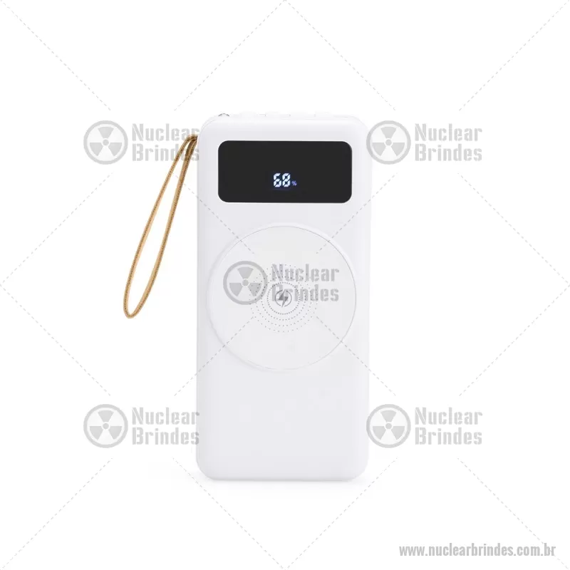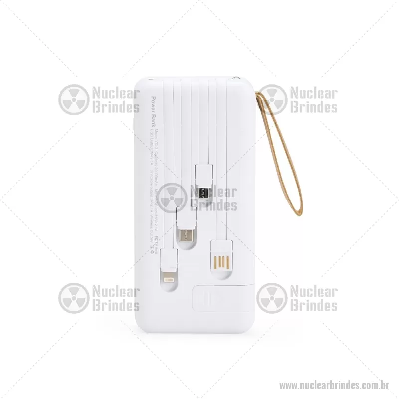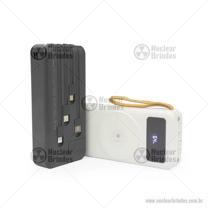 Carregador Power Bank USB 20.000mAh Descrição: Power bank em plástico com capacidade de 20.000mAh, painel de LED que indica o percentual de bateria, alça em couro sintético para transporte e suporte lateral que permite apoiar aparelhos na horizontal. Possui quatro cabos acoplados, incluindo: USB-C, Micro USB, Lightning e Cabo USB, além de espaço reservado para carregamento por indução de aparelhos compatíveis. Dispõe ainda de conexões USB-C, Micro-USB e USB para recarga do próprio dispositivo. Altura : 14,5 cm x Largura : 7 cm x Espessura : 3,5 cm Peso aproximado (g): 424 - Brindes Personalizados - NUCTEC530