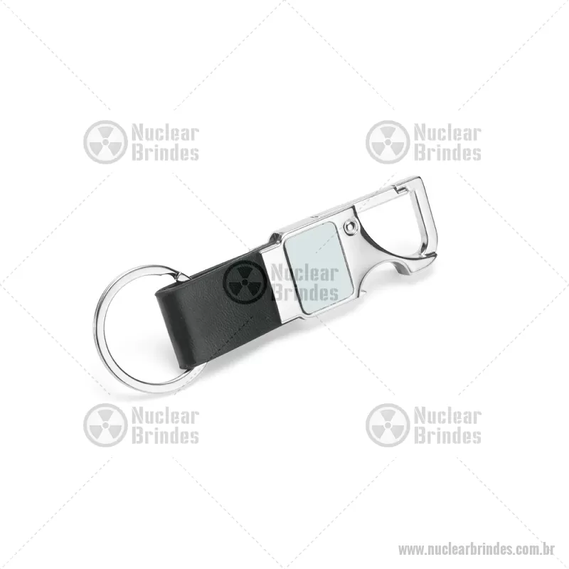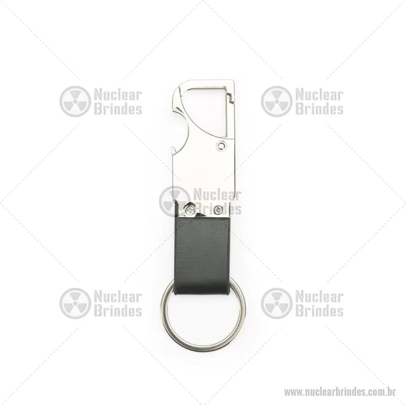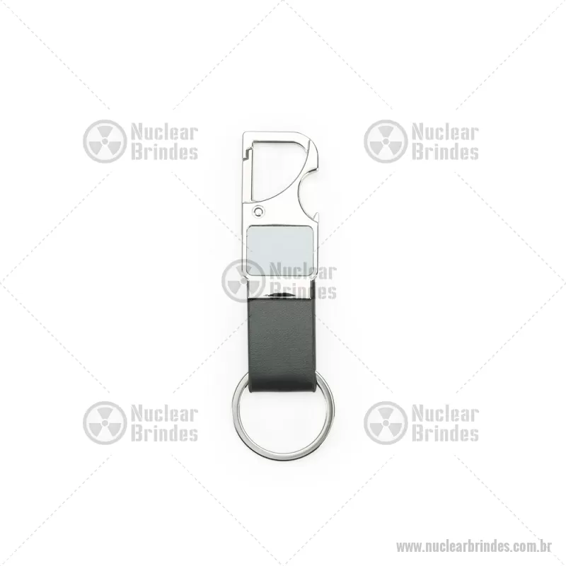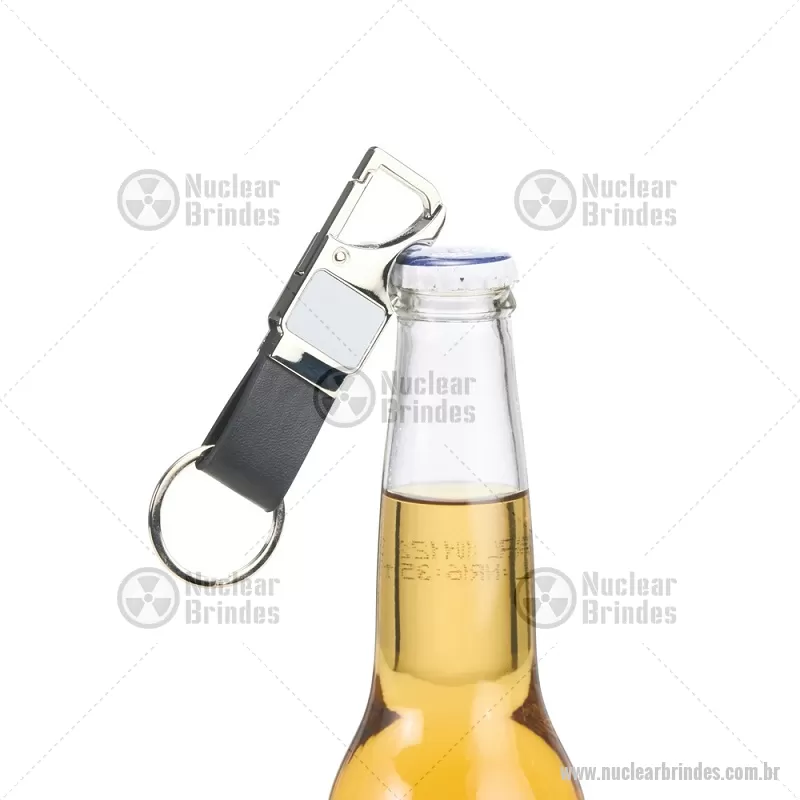 Chaveiro em metal com tira em couro sintético, equipado com mosquetão e função abridor de garrafas. Prático e funcional para o dia a dia. - Brindes Personalizados - NUCCHV215