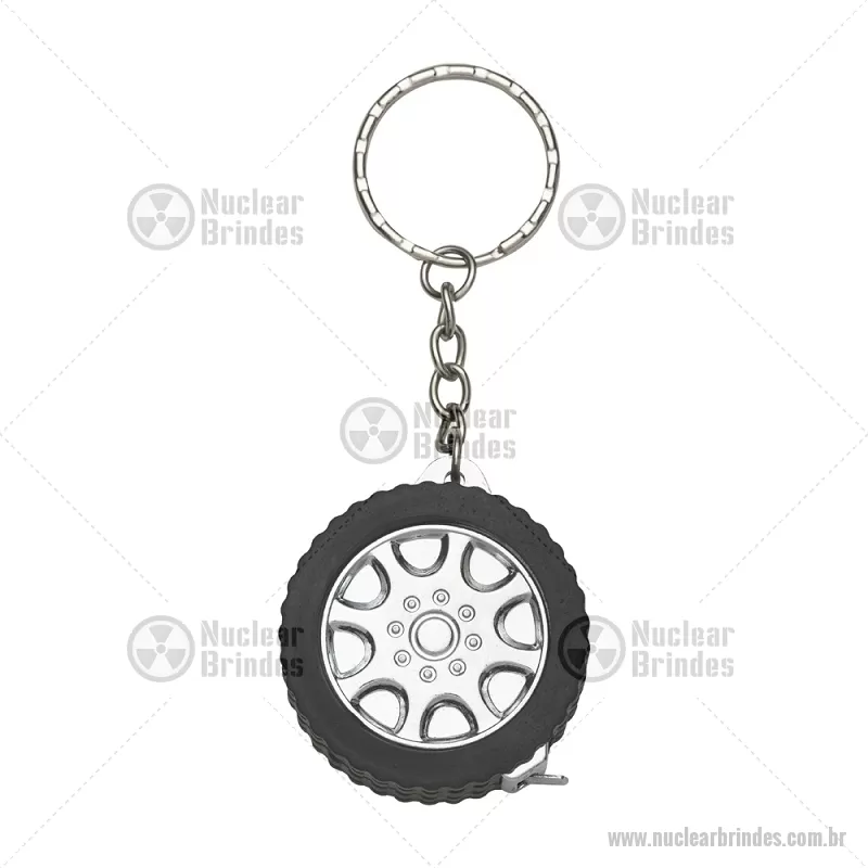 Chaveiro Plástico Trena 1 Metro Descrição: Chaveiro plástico em formato de pneu de carro e argola metálica. Possui uma trena com fita de alcance máximo de 1 metro, além de exibir suas medidas em pés e polegadas. Largura : 4,1 cm x Espessura : 1,6 cm x Comprimento : c/ argola: 10cm Tamanho total aproximado (CxL): 10,1 cm x 4,1 cm Peso aproximado (g): 24 - Brindes Personalizados - NUCFTR020
