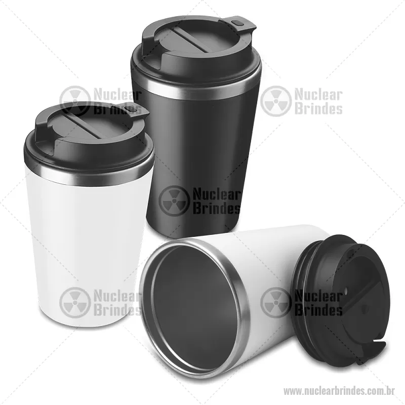 Copo térmico 350 ml com parede dupla, interior em inox 304 e exterior em plástico PP, tampa em plástico PP e acabamento com pintura fosca. *Interior do copo é produzido em inox 304 e a parte externa em plástico PP. Peso do Produto: 0,161kg Dimensão do Produto: 14,5xø9,5cm - Brindes Personalizados - NUCCPO152