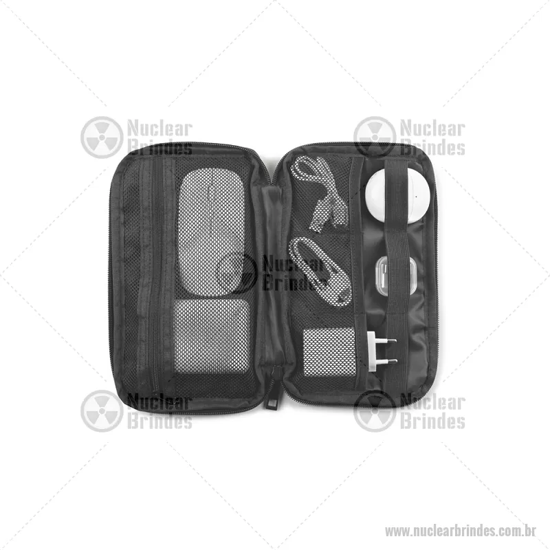 Bolsa organizadora em poliéster reciclado 600D de alta densidade com compartimento principal espaçoso para acessórios tecnológicos Bolsa organizadora para acessórios tecnológicos, recomendada para cabos, carregadores e pequenos dispositivos. Composta por poliéster reciclado 600D de alta densidade e forro em poliéster reciclado 210D. O compartimento principal contém vários bolsos para organizar individualmente todos os seus acessórios de maneira personalizada e funcional. Medidas: 220 x 130 x 25 mm Peso do Produto (g.): 72 - Brindes Personalizados - NUCEMB047