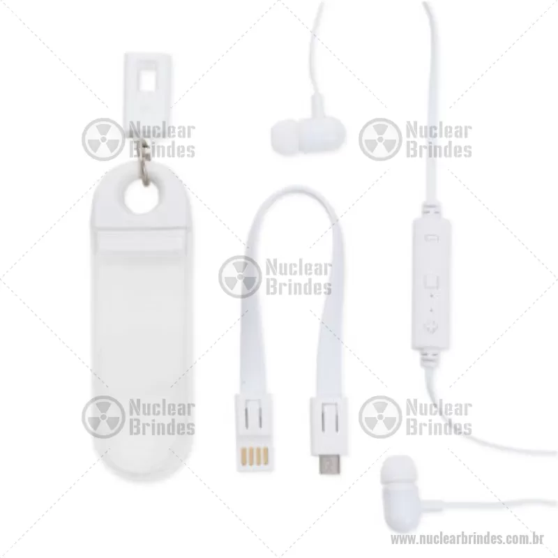 Fone de ouvido bluetooth com estojo e cabo para recarga. Entrada 5V/40mA Capacidade da Bateria 40mAh Tempo de recarga 1,5hrs Tempo de funcionamento continuo 2,0hrs Entrada Micro USB Bluetooth 5.0 - Brindes Personalizados - NUCTEC385