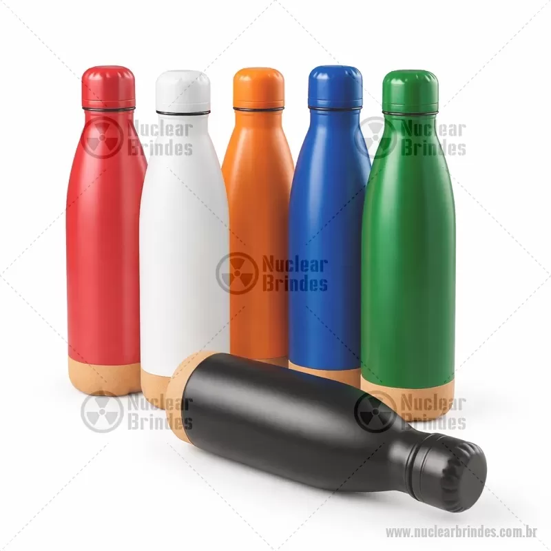Garrafa térmica com capacidade de 500 ml, produzida em aço inox e base em cortiça, que agrega charme e estabilidade ao uso. Conta com parede dupla e vedação a vácuo, garantindo maior conservação da temperatura de bebidas quentes ou frias por mais tempo. Possui tampa plástica rosqueável, prática e segura, ideal para o dia a dia com um toque de estilo e funcionalidade. - Brindes Personalizados - NUCGAT171