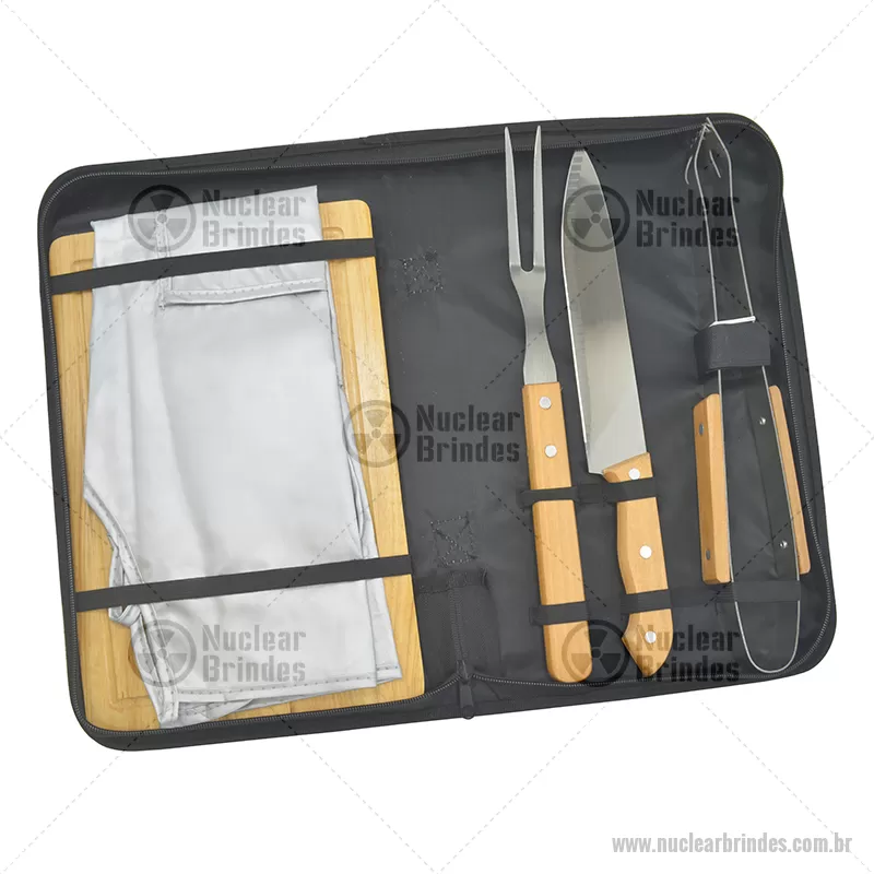 Kit churrasco com 5 pçs. Contém: uma faca, um garfo trinchante, um pegador, uma tábua de Corte e um avental com bolso frontal. Acompanha estojo resistente preto com zíper. - Brindes Personalizados - NUCKCH035