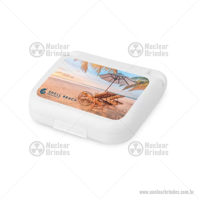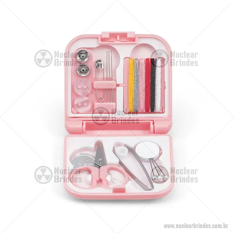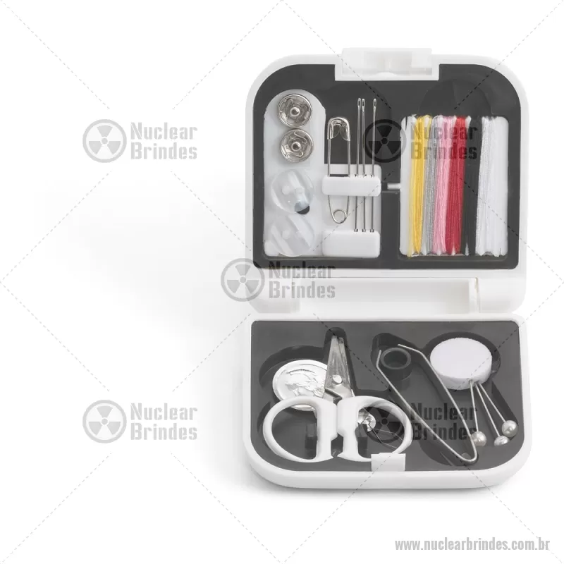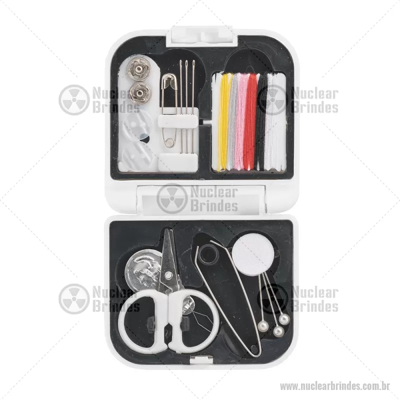 Kit de costura prático e leve para viagem Conjunto de costura prático e leve para levar em viagem. Composto por 3 alfinetes, 3 agulhas, 1 pinça, 1 tesoura, 1 enfia linha, 1 alfinete, 2 botões, 2 colchetes e 6 rolos de linhas de várias cores. Fornecido em estojo. Medidas: 70 x 21 x 65 mm Peso do Produto (g.): 46 - Brindes Personalizados - NUCFEM084