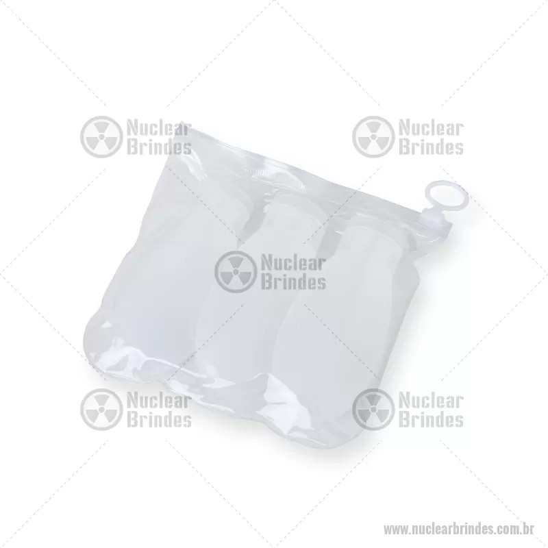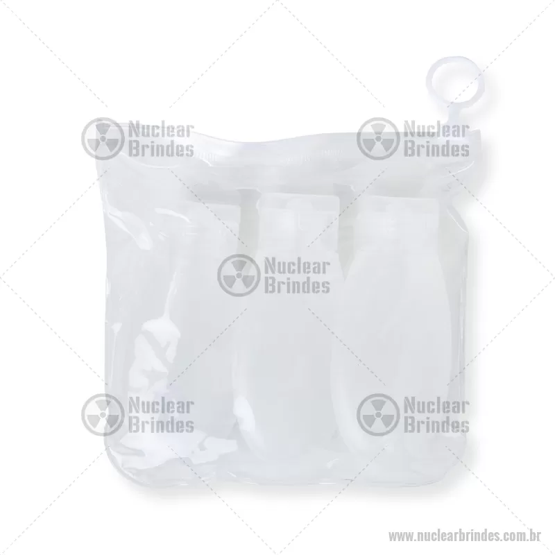 O kit viagem 3 Peças é a escolha perfeita para quem busca praticidade e organização durante as viagens. O conjunto inclui três frascos plásticos de 60ml, ideais para transportar líquidos e produtos de higiene pessoal, respeitando as normas de segurança para viagens aéreas. O estojo de PVC com ziplock mantém os itens organizados e seguros, além de evitar que a umidade espalhe para a área externa, caso os itens estejam molhados. Estojo: Altura : 14,9 cm x Largura : 15,1 cm Tamanho total aproximado (CxL): Frasco 10,7 cm x 5,1 cm Peso aproximado (g): 50 - Brindes Personalizados - NUCKVG018