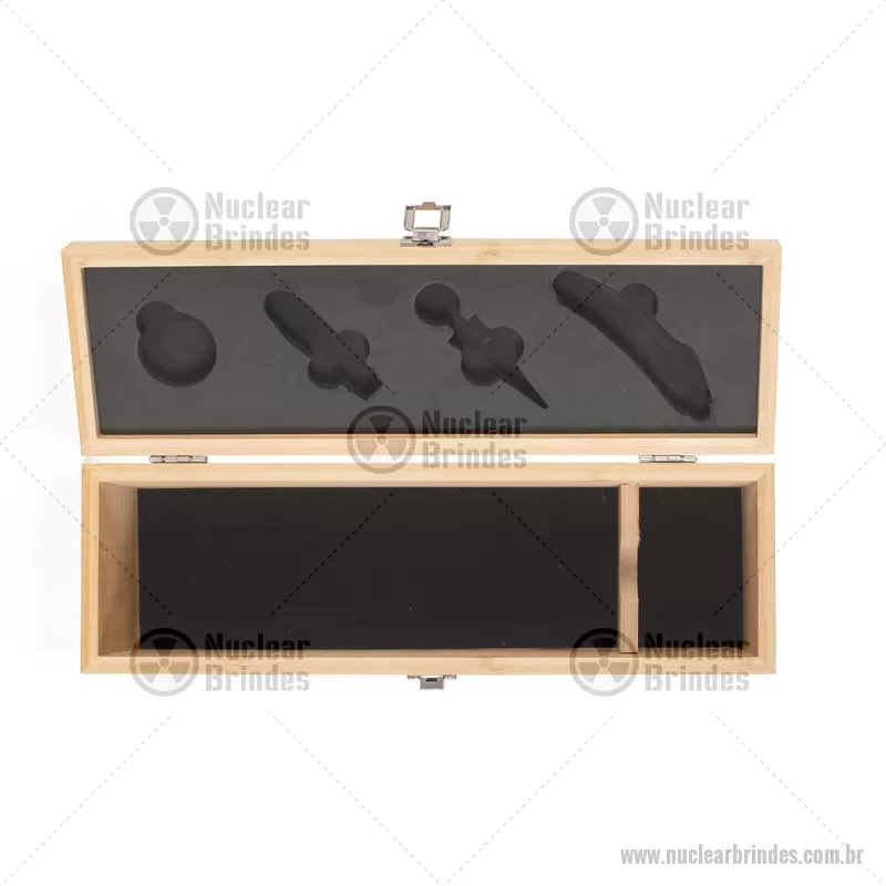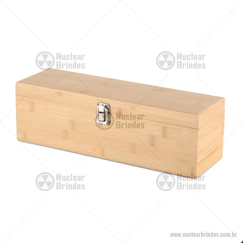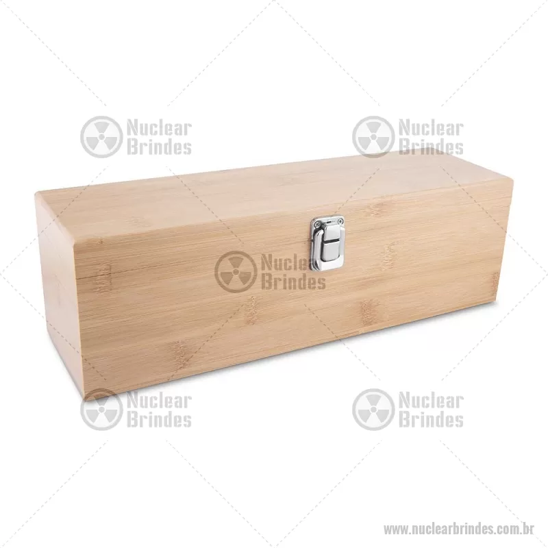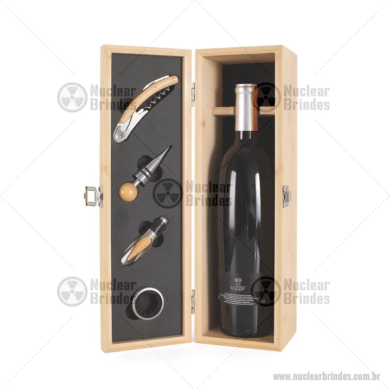 Kit Vinho em bambu com interior em EVA e fecho em inox, suporte para garrafa de vinho de 750 ml (padrão). Contém: saca-rolha de metal com detalhes em bambu e cortador de lacre, anel corta-gotas de metal, bico para servir de metal com tampa em bambu e tampa de metal com detalhe em bambu. Peso do Produto: 0,997kg Dimensão do Produto: 11x36x11cm *Não acompanha garrafa vinho, imagem meramente ilustrativa. - Brindes Personalizados - NUCKVI051