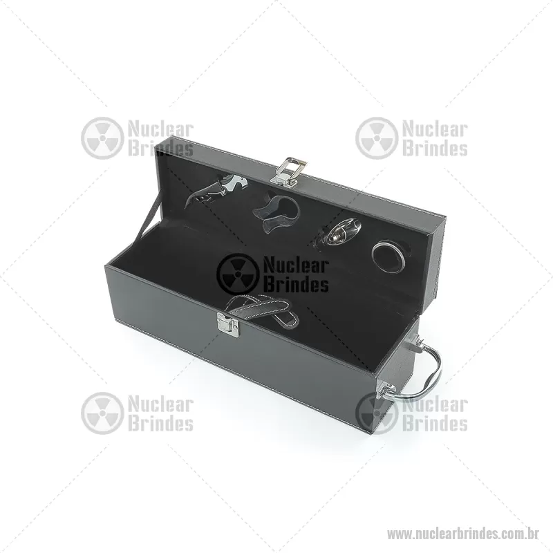Kit vinho 4 peças em maleta de couro sintético. Contém saca-rolhas metálico, bico condutor com tampa, cortador de lacre e wine colar. Maleta com alça, trava de segurança e parte interna revestida de veludo com área de acomodação para garrafa. Altura : 11,9 cm x Largura : 11,4 cm x Comprimento : 34,2 cm Peso aproximado (g): 752 - Brindes Personalizados - NUCKVI046