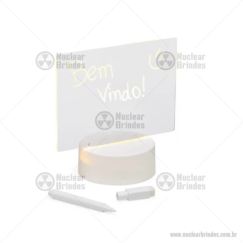 Luminária de Mesa Led Deixe qualquer espaço mais aconchegante e repleto de recadinhos incríveis com a nossa luminária. Com sua tela acrílica 3D, é possível soltar a criatividade e deixar mensagens inspiradoras, lembretes importantes ou até desenhos fofos, tudo de um jeito prático e super divertido! Com um funcionamento super simples, ela se conecta com cabo via USB integrado à base plástica ou por meio de 3 pilhas AAA (1.5V) não inclusas. Além disso, acompanha uma caneta plástica com apagador integrado, tornando a experiência ainda mais interativa e funcional. Essa luminária é perfeita para iluminar o ambiente e deixar recadinhos incríveis do seu jeito! Altura : 15,3 cm x Largura : 15 cm x Profundidade : 8,6 cm Tamanho total aproximado (CxL): Caneta: 11,2 cm x 1,2 cm Peso aproximado (g): 128 - Brindes Personalizados - NUCLL031