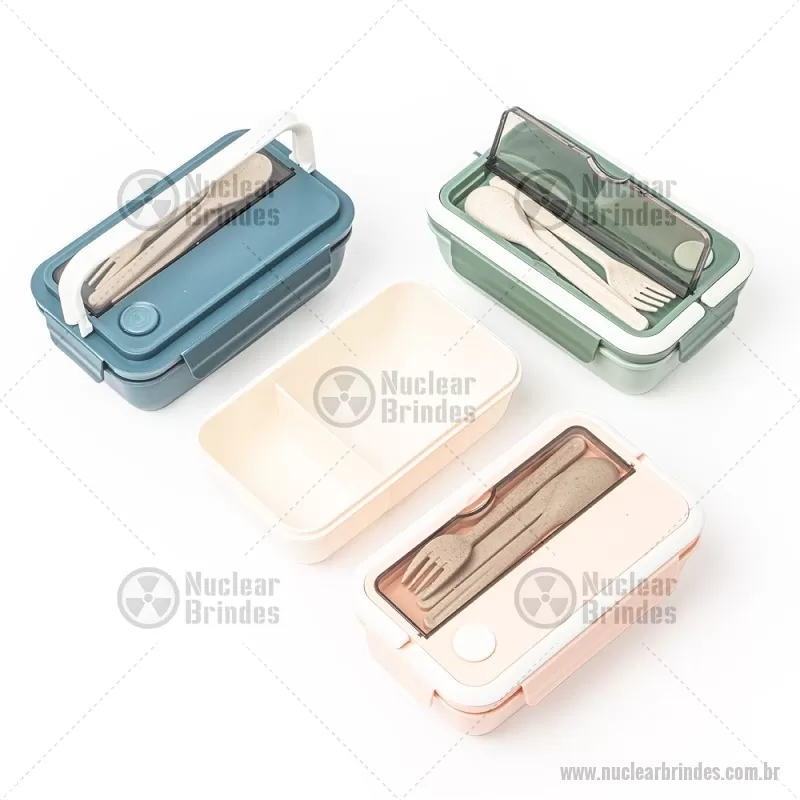 Marmita hermética de 1 litro com divisórias e 3 talheres. Feita em PP atóxico e livre de BPA, é completamente segura para armazenar alimentos. A tampa possui travas de segurança, supervedação, silicone com respiro e alças que facilitam o transporte. Os talheres podem ser guardados em um compartimento separado com tampa transparente, garantindo praticidade durante as refeições. Além disso, as duas divisórias internas mantêm os alimentos separados, preservando o sabor de cada um. Uma escolha inteligente para uma vida prática e saudável. Altura : 9 cm Largura : 22,5 cm Espessura : 8 cm Peso aproximado (g): 236 Características Técnicas Medidas Colher (A x L x E): 16 cm x 3 cm x 0,4 cm Medidas Garfo (A x L x E): 15 cm x 2,5 cm x 0,4 cm Medidas Faca (A x L x E): 15 cm x 1,6 cm x 0,4 cm - Brindes Personalizados - NUCMMT022