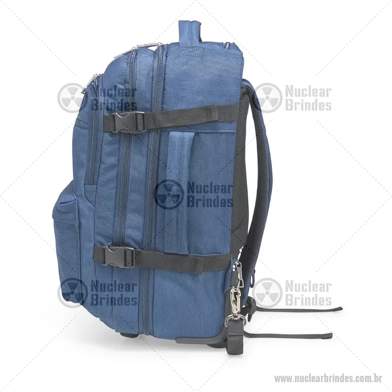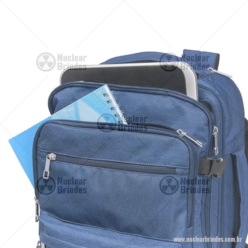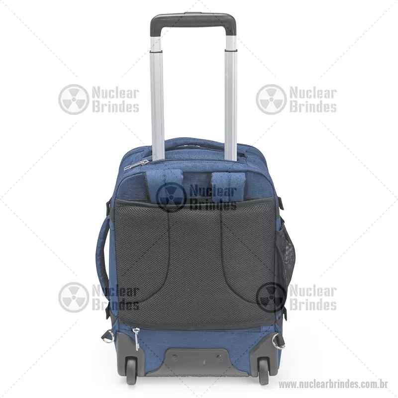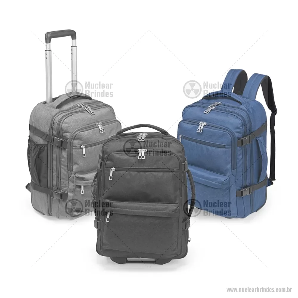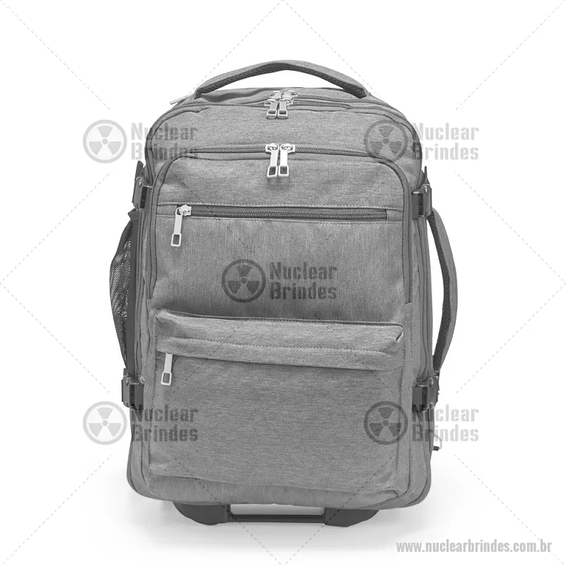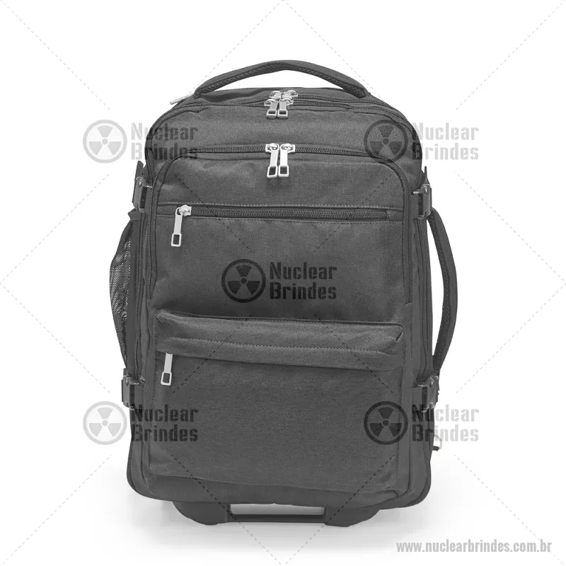 Mochila Poliéster 24L Mochila em poliéster impermeável com capacidade para até 24 litros. Possui compartimento interno principal com dois bolsos de fechamento em zíper e cinta compressora para roupas. Conta ainda com dois compartimentos frontais, sendo um deles com divisória para notebooks de até 15,6 polegadas, um par de bolsos menores com fechamento em zíper e um bolso lateral em tela de nylon. Dispõe também uma alça retrátil contida em um compartimento fechado em zíper e duas rodinhas para oferecer mais uma possibilidade de uso, além de duas alças de mão, uma na parte superior e outra na lateral, permitindo o transporte pela horizontal, e duas alças para as costas com revestimento em tecido acolchoado. Altura : 45 cm x Largura : 31 cm x Profundidade : 16 cm Peso aproximado (g): 2409 - Brindes Personalizados - NUCMC241