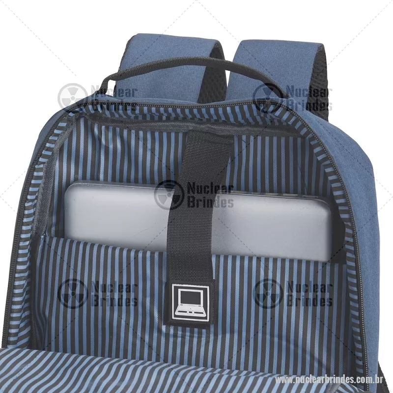 Mochila de nylon 20 Litros com 3 compartimentos, sendo o principal com bolso para notebook 15,6. Com divisórias internas para acessórios, a mochila possui bolso lateral, suporte externo USB e alça para encaixe em malas e viagens. - Brindes Personalizados - NUCMC195