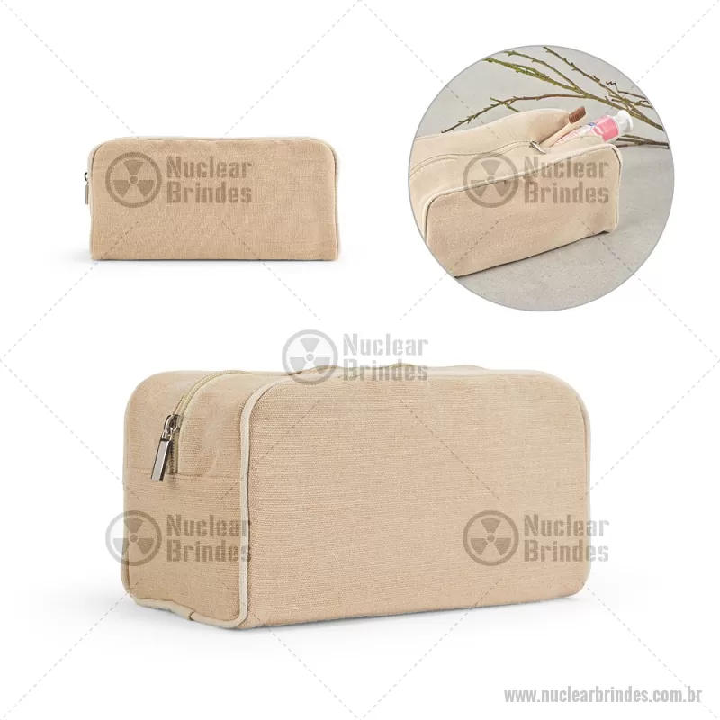 Nécessaire de cosméticos em juco (mistura de algodão e juta, 260g/m²) em juco com interior forrado em 70% algodão reciclado e 30% poliéster reciclado Bolsa de cosméticos em juco (mistura de algodão e juta, 260g/m²) com interior forrado em tecido 70% algodão reciclado e 30% poliéster reciclado. Compartimento espaçoso com zíper. 250 x 130 x 100 mm Peso do Produto (g.): 110 - Brindes Personalizados - NUCNC135