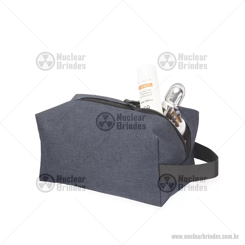 Nécessaire em nylon resistente à água, com fechamento em zíper e puxador funcional. Possui alça lateral em couro sintético, facilitando o transporte e tornando o uso mais prático no dia a dia ou em viagens. - Brindes Personalizados - NUCNC151