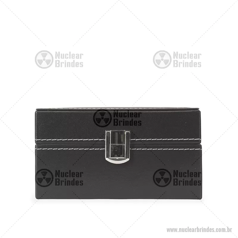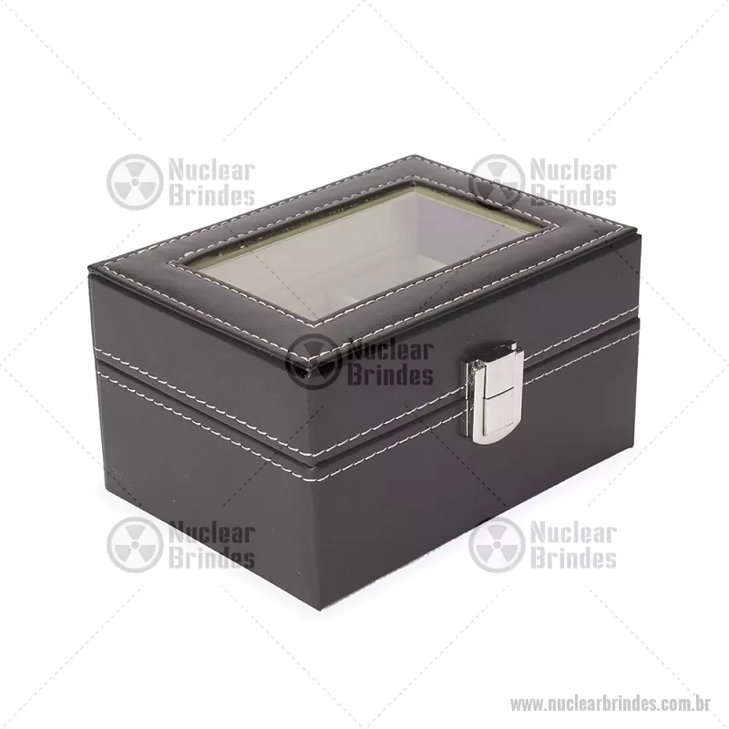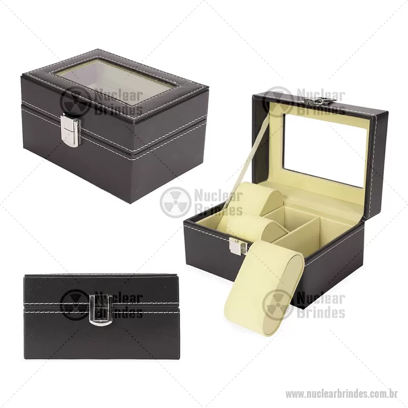 Estojo porta relógios com acabamento externo em couro sintético à base de PVC e interior revestido em veludo macio. Possui duas divisórias com almofadas removíveis para acomodar os relógios, tampa com visor de vidro e fecho com trava de segurança, garantindo proteção e organização com elegância. - Brindes Personalizados - NUCPREL002