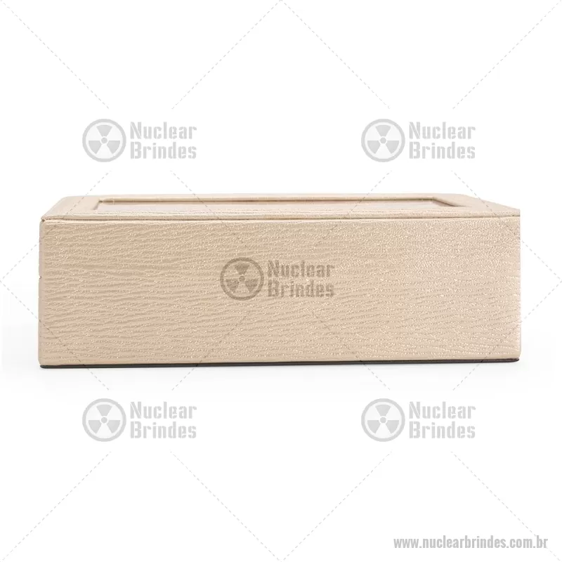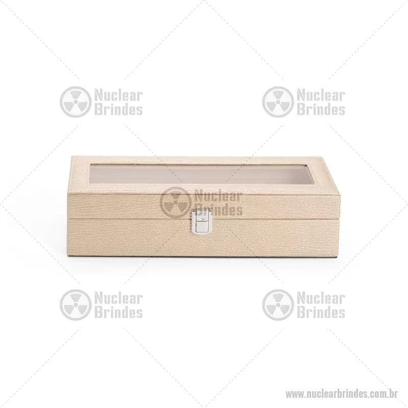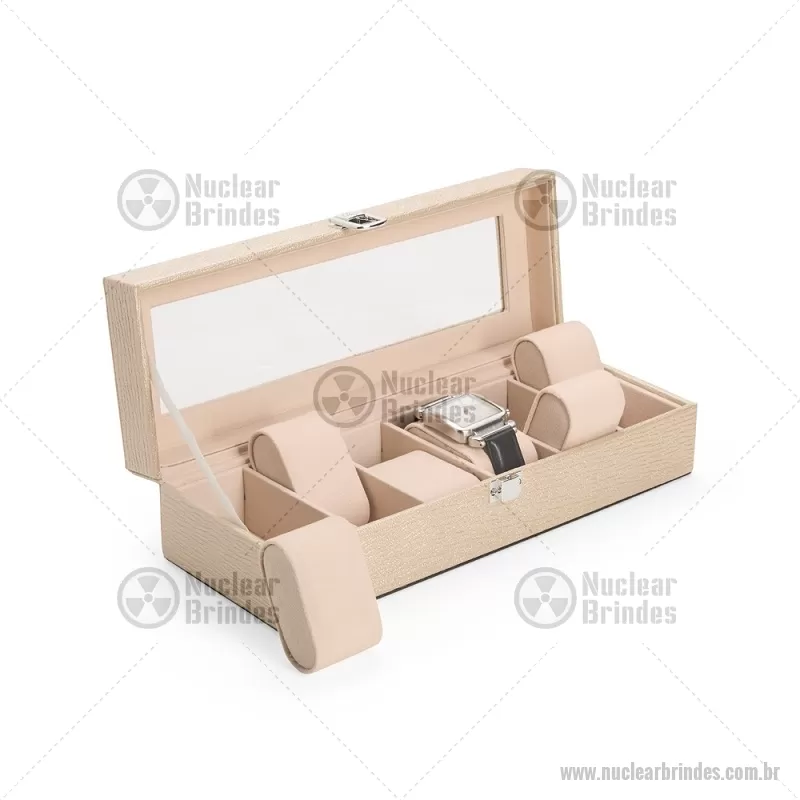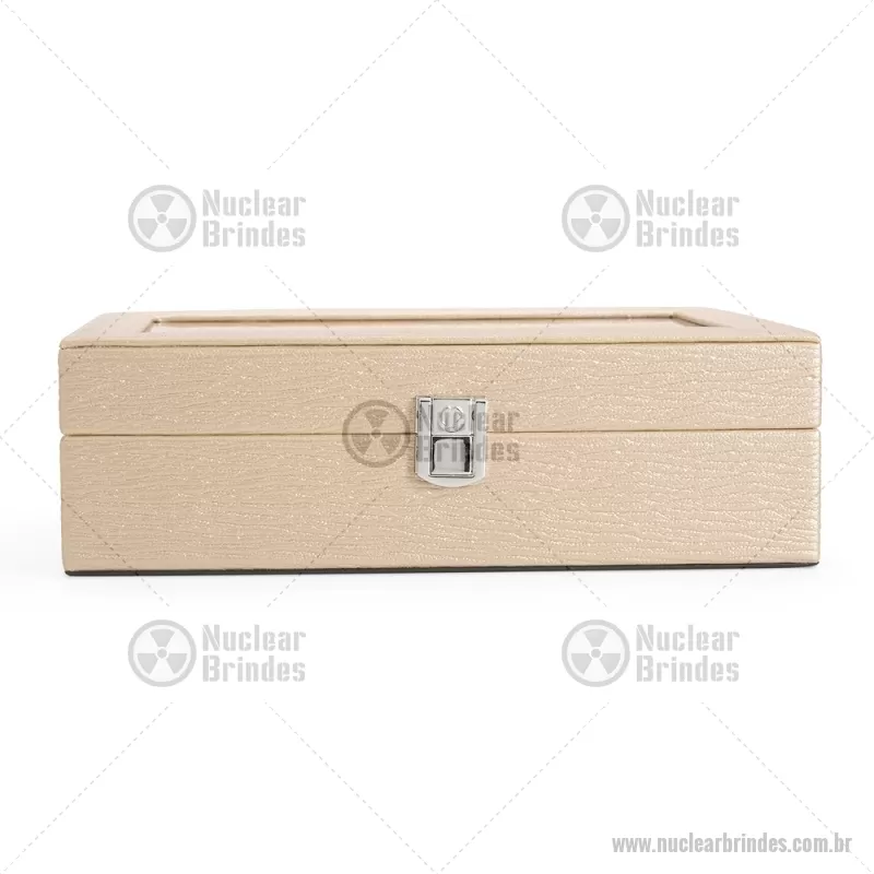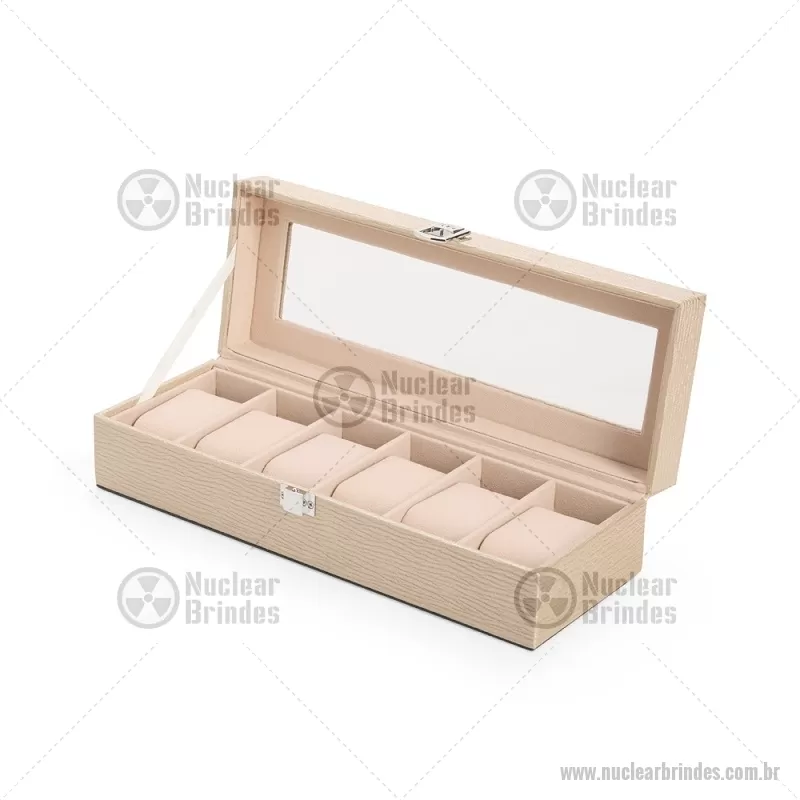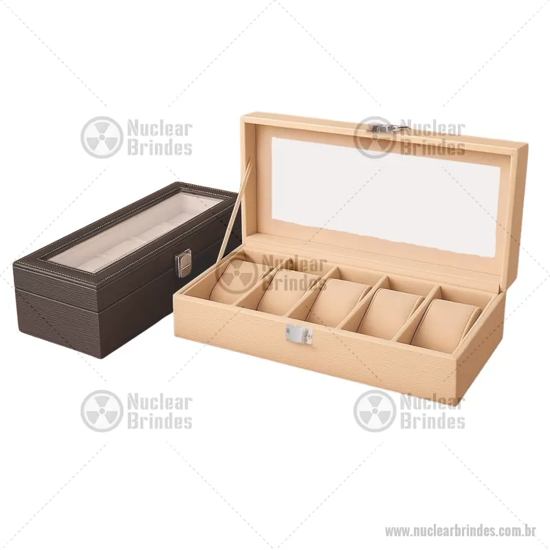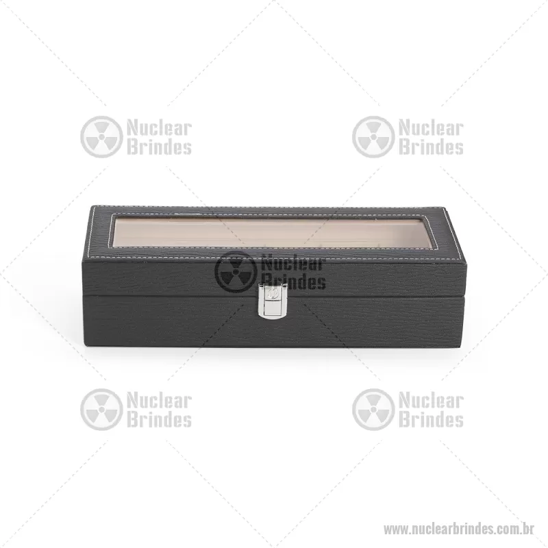 Porta-relógios com acabamento em couro sintético texturizado à base de PVC e interior revestido em tecido aveludado. Possui seis compartimentos com almofadas removíveis, visor em vidro transparente e trava de segurança, ideal para organizar e proteger relógios com elegância. - Brindes Personalizados - NUCPREL004