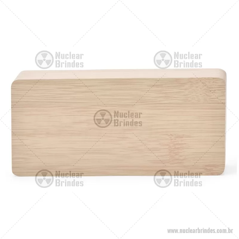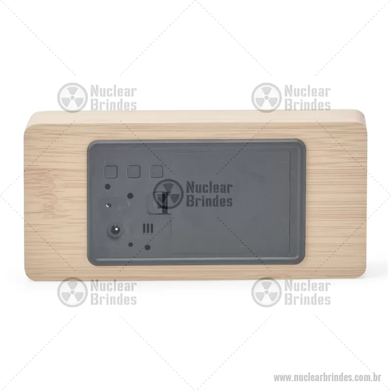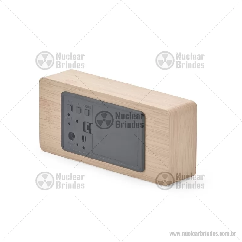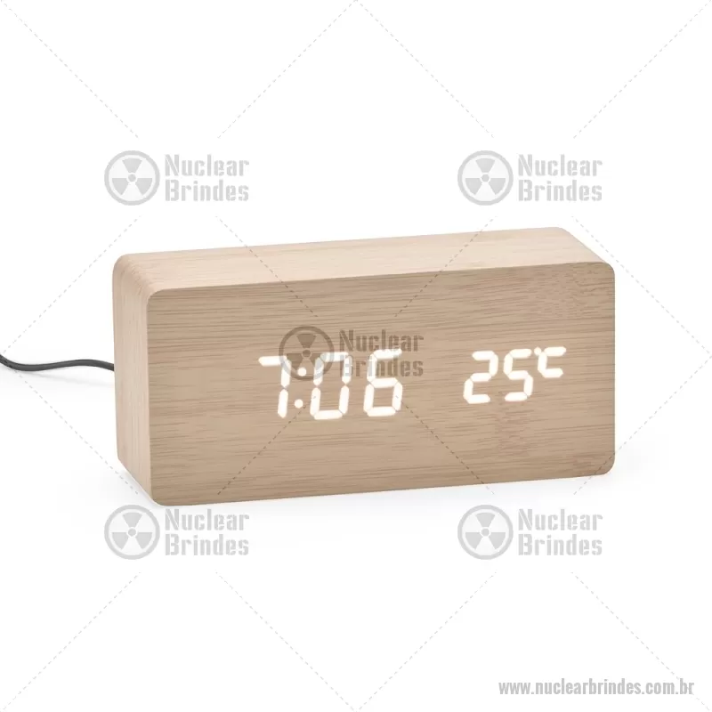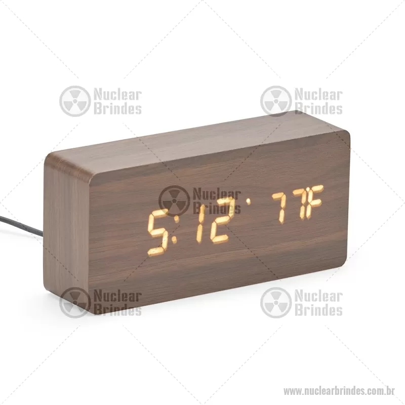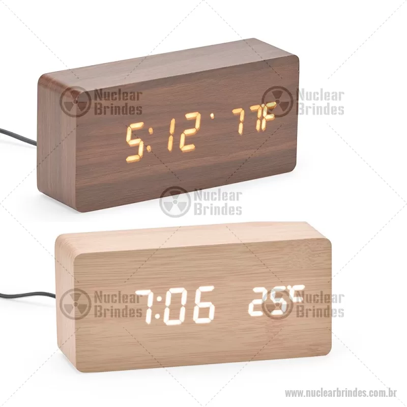 Relógio despertador em madeira com display LED, que combina design elegante e tecnologia moderna. Exibe horas, data e temperatura ambiente, além de permitir a programação de até três alarmes com diferentes configurações. Pode ser alimentado por 4 pilhas AAA (não inclusas) ou por cabo USB DC 5V, que acompanha o produto, oferecendo praticidade para o uso diário. - Brindes Personalizados - NUCREL023